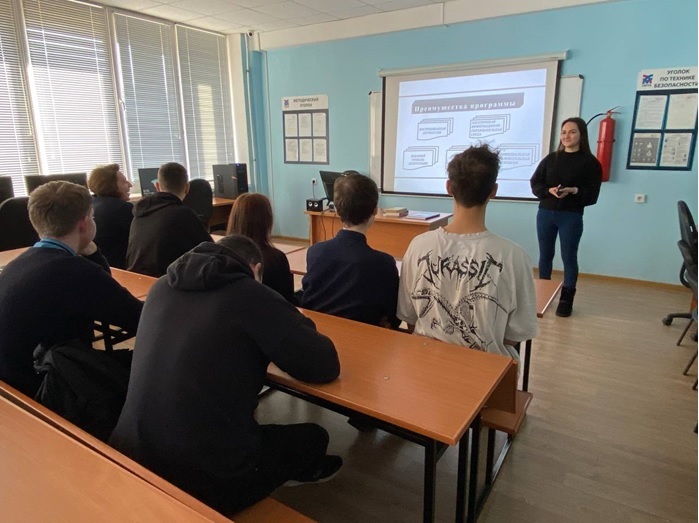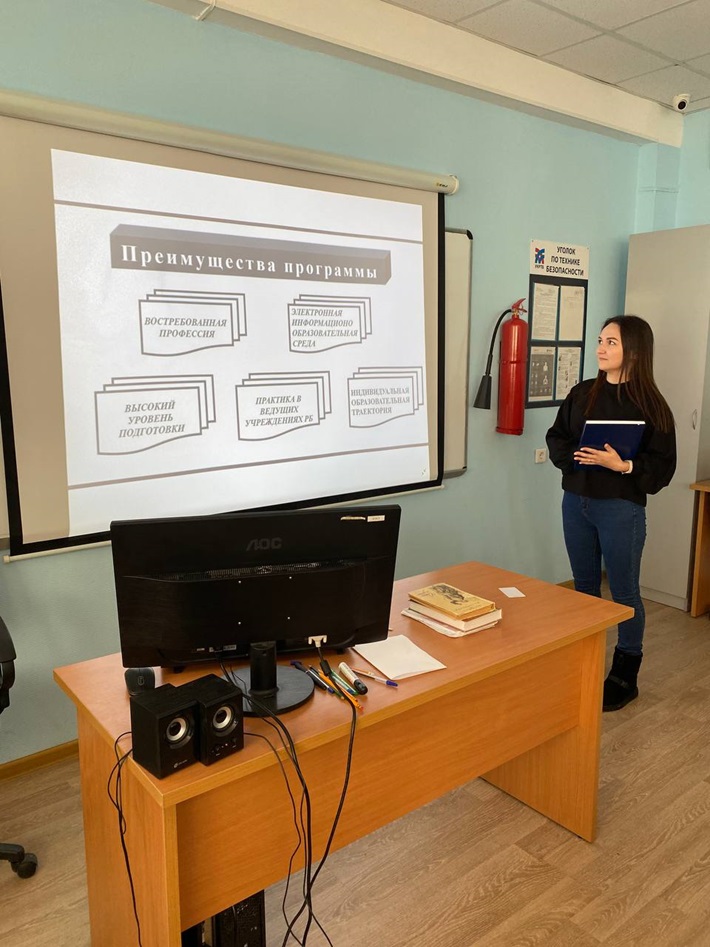 В ГБПОУ «Уфимский колледж радиоэлектроники, телекоммуникаций и безопасности» проведено профориентационное занятие со студентами группы 9ИКСС-13-22. Студентка 4 курса заочного отделения профиль "Экономика и управление" Иванова Анна рассказывала о направлении 44.03.04 Профессиональное обучение, направленность (профиль) "Экономика и управление". Обучающиеся колледжа были проконсультированы относительно форм обучения, условий поступления, наличия бюджетных мест, особенностей обучения, профессорско-преподавательского состава. Также Анна поделилась с ребятами успехами в учебной деятельности.