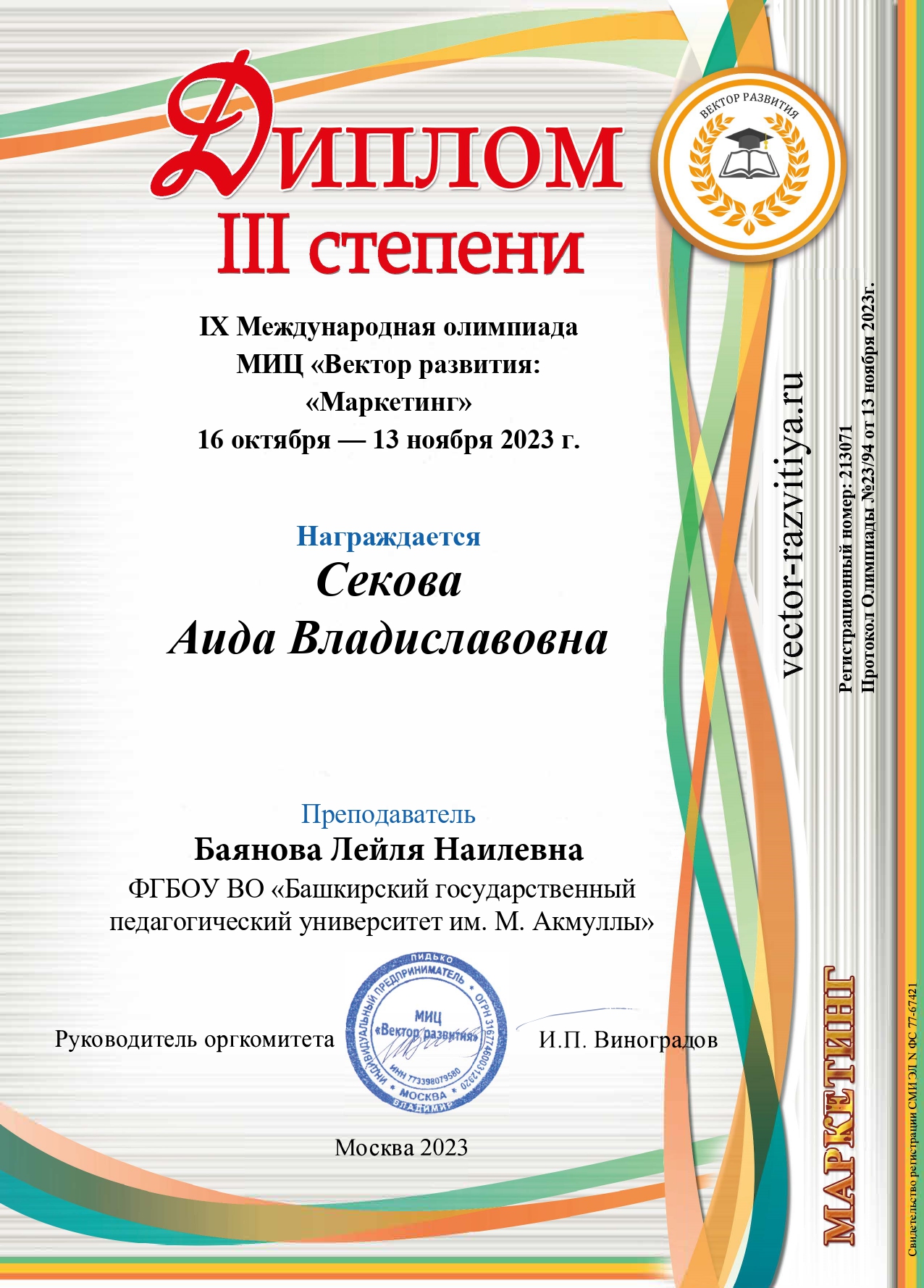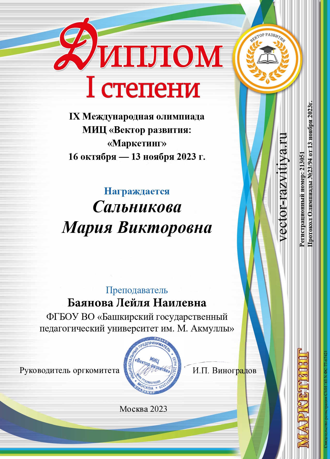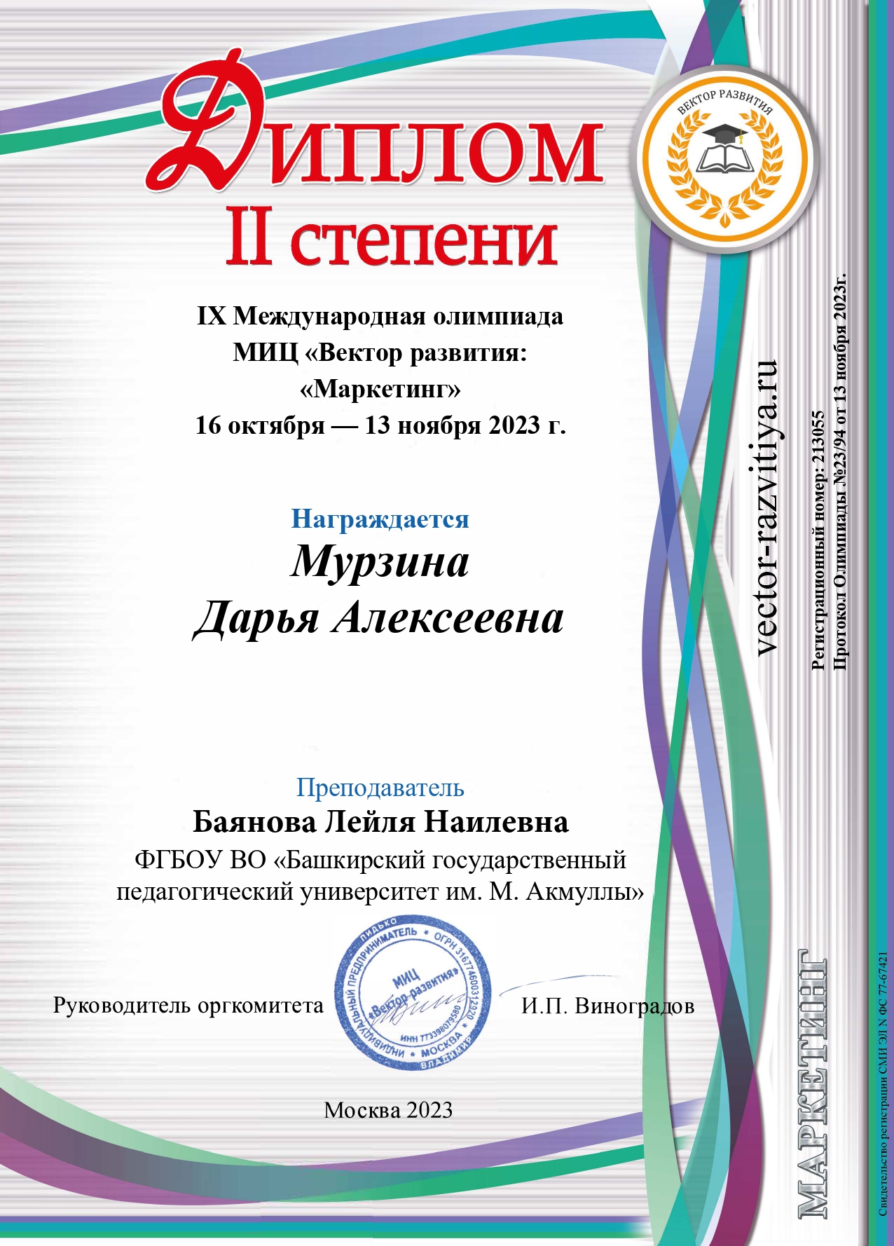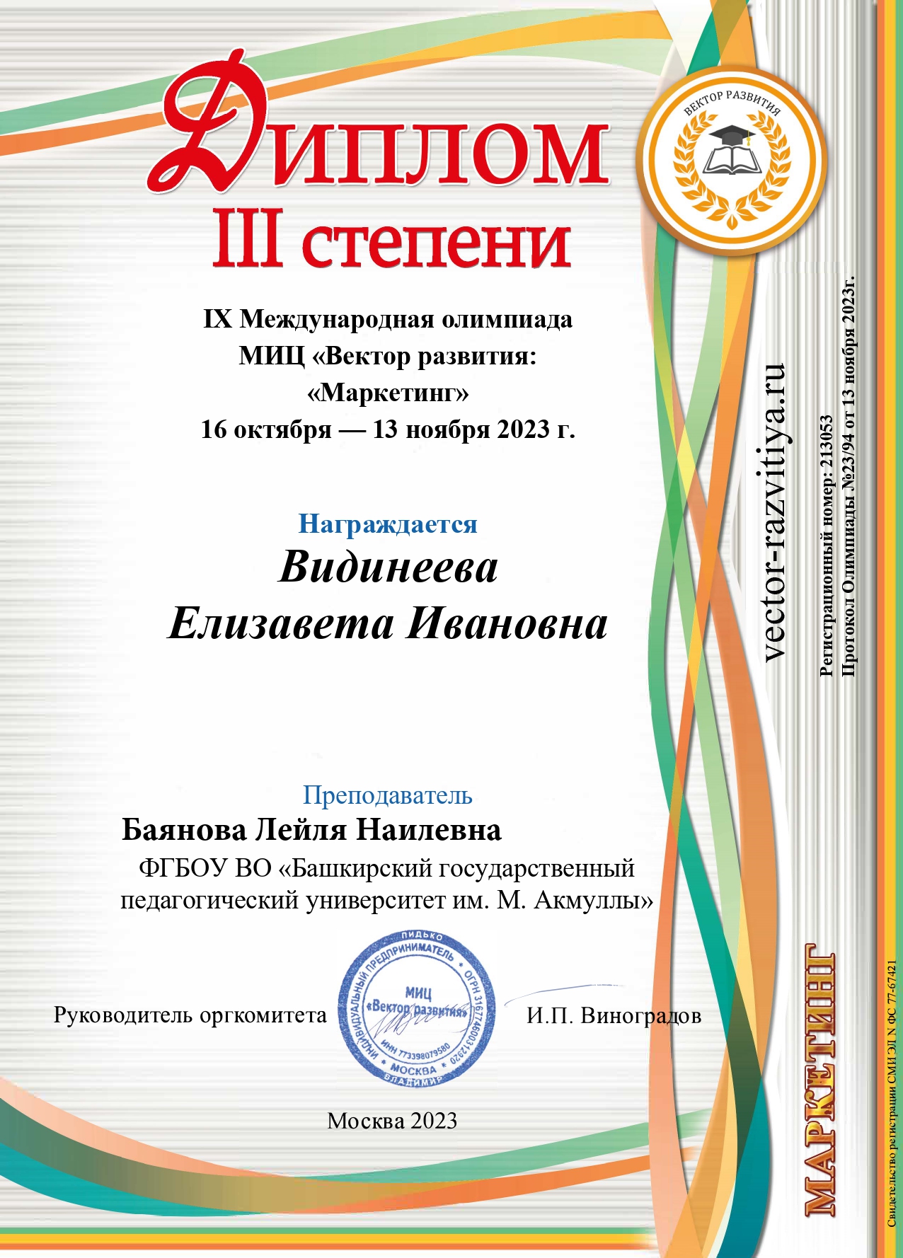С 16 октября по 13 ноября 2023 года прошла IX Международная олимпиада МИЦ Вектор развития: «Маркетинг». В ней приняли участие члены студенческого клуба «Экономический капустник» – студенты 4 и 5 курса профиля «Мировая художественная культура и экономика» под руководством доцента кафедры культурологии и социально – экономических дисциплин Баяновой Л.Н. и показали следующие результаты: