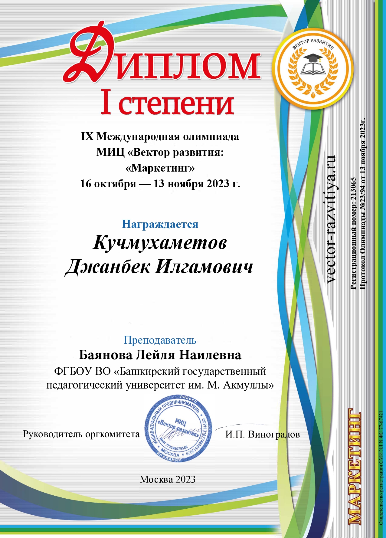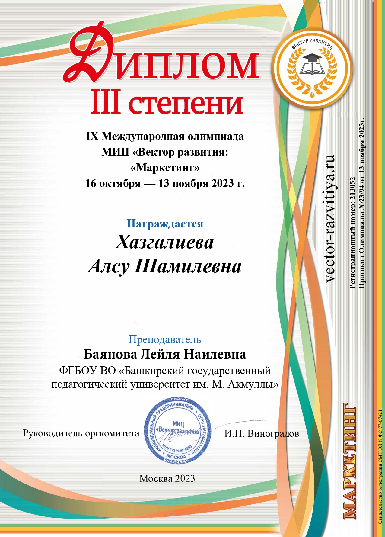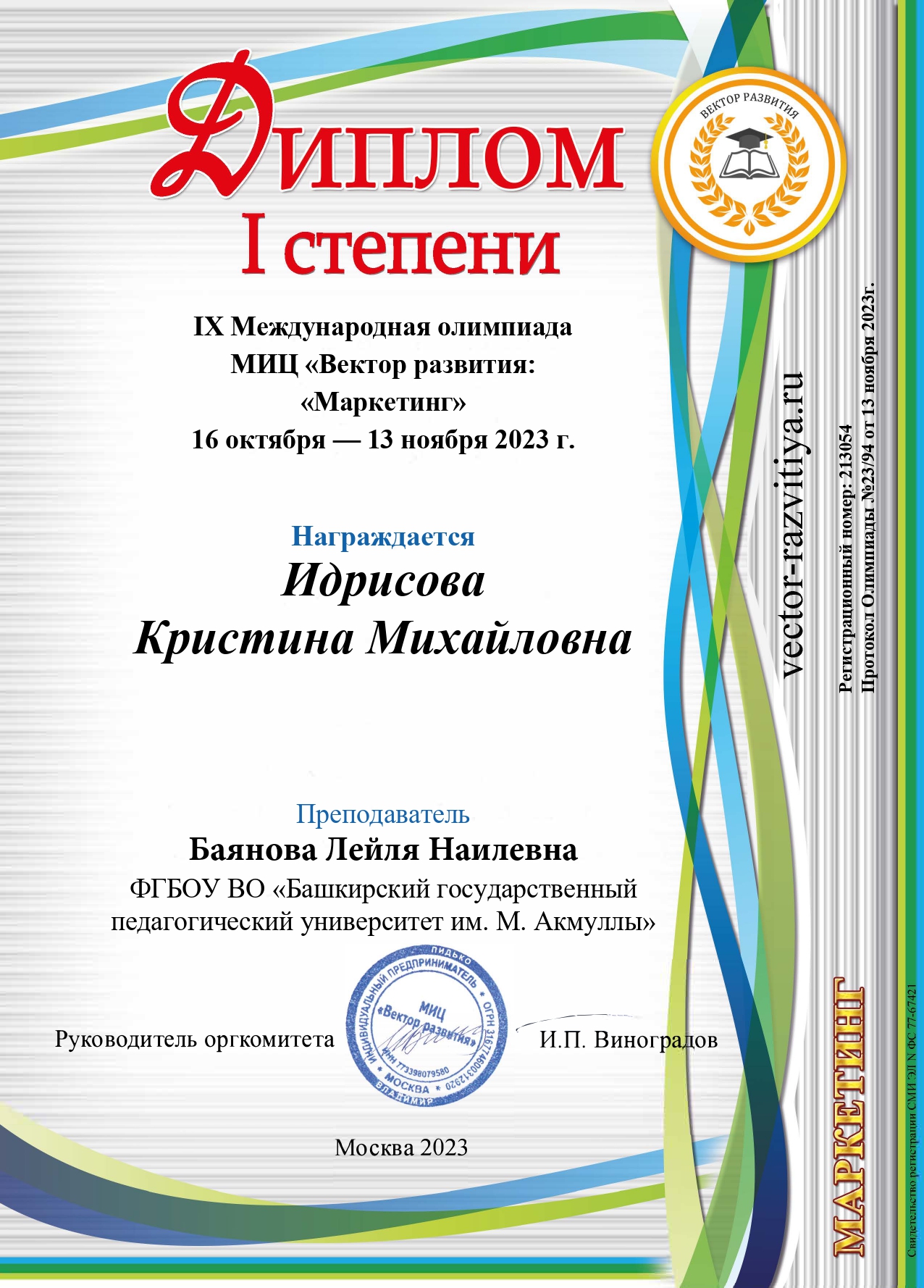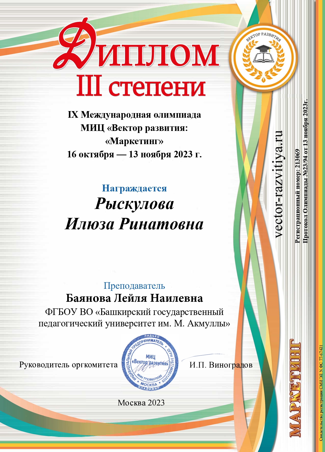 С 16 октября по 13 ноября 2023 года прошла IX Международная олимпиада МИЦ Вектор развития: «Маркетинг». В ней приняли участие члены студенческого клуба «Экономический капустник» – студенты 4 и 5 курса профиля «Мировая художественная культура и экономика» под руководством доцента кафедры культурологии и социально – экономических дисциплин Баяновой Л.Н. и показали следующие результаты: