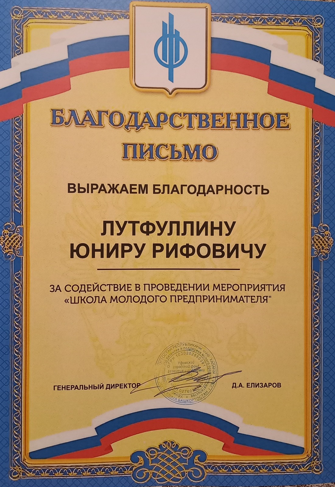 В завершении мероприятия от имени генерального директора Уфимского городского фонда развития поддержки и предпринимательства была выражена благодарность профессору Лутфуллину Ю.Р. и  старшему преподавателю Нефедовой В.Н. за содействие в проведении мероприятия «Школа молодого предпринимателя» и вручены благодарственные письма.