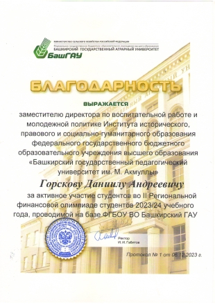 Оргкомитет II-й Республиканской финансовой олимпиады отметил высокую организованность и дисциплинированность студентов-экономистов БГПУ им. М. Акмуллы и выразил благодарность заместителю директора по воспитательной работе и молодежной политике ИИПСГО Горскову Д.А.