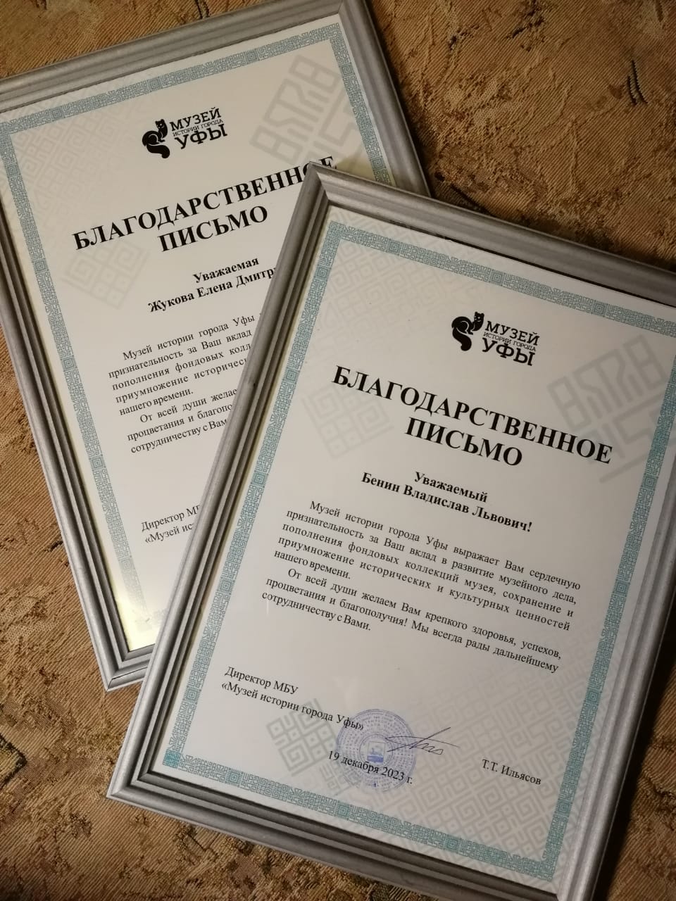 Профессор В.Л. Бенин и доцент Е.Д. Жукова получили благодарственные письма от Музея истории города Уфы