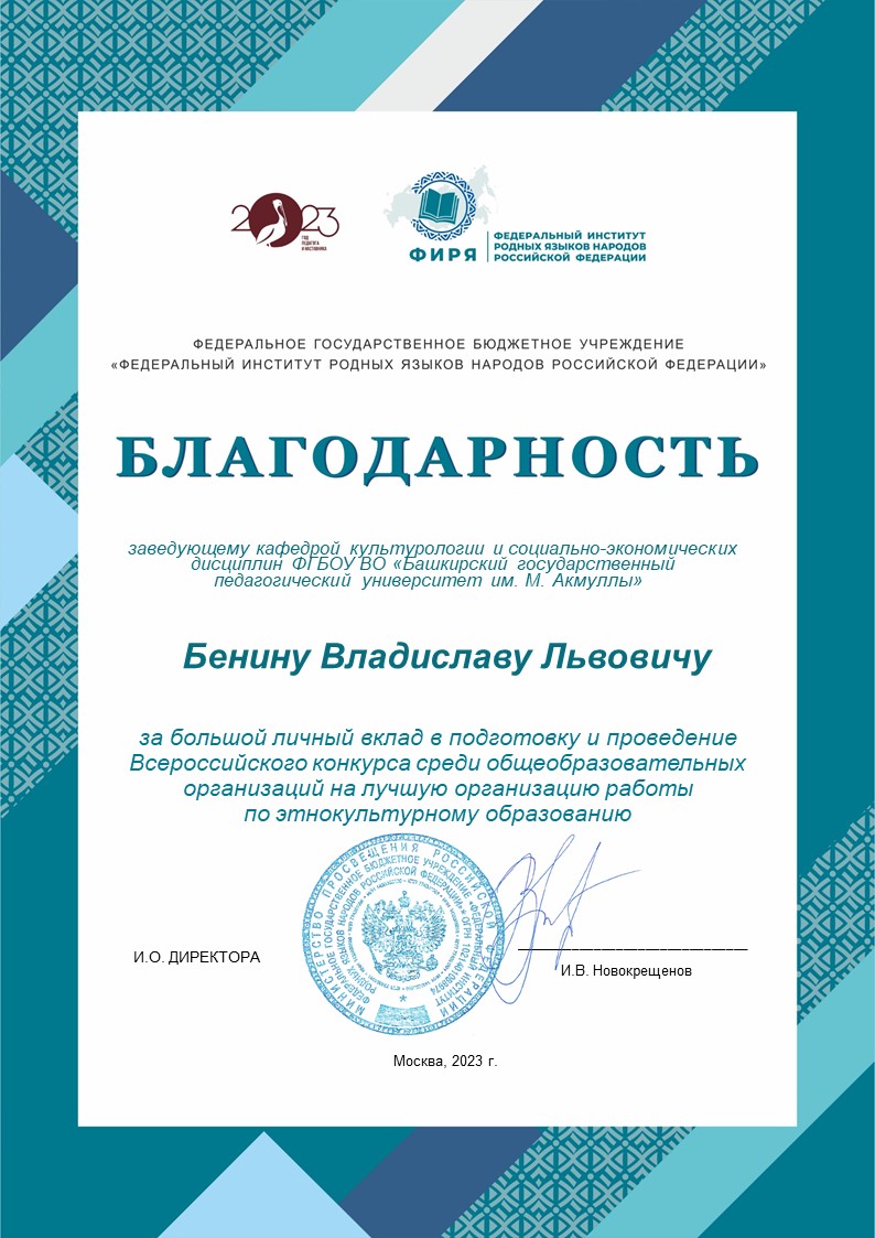 Заведующему кафедрой культурологии и социально-экономических дисциплин, профессору В.Л. Бенину объявлена благодарность от ФГБУ "Федеральный институт родных языков народов Российской Федерации" за большой личный вклад в подготовку и проведение Всероссийского конкурса среди общеобразовательных организаций на лучшую организацию работы по этнокультурному образованию.