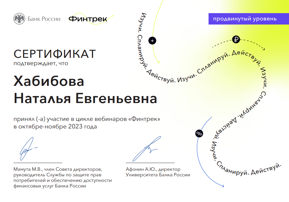 20 декабря доцент Хабибова Н.Е. приняла участие во втором  цикле вебинаров «Финтрек» (организатор цикла Банк России при поддержке Министерства науки и высшего образования и Министерства просвещения РФ). Основными целями проведения цикла вебинаров являются: содействие повышению уровня финансовой грамотности студентов; формирование универсальной компетенции по экономической культуре, в том числе финансовой грамотности; развитие у студентов навыков принятия решений в области управления личными финансами в современных условиях.
