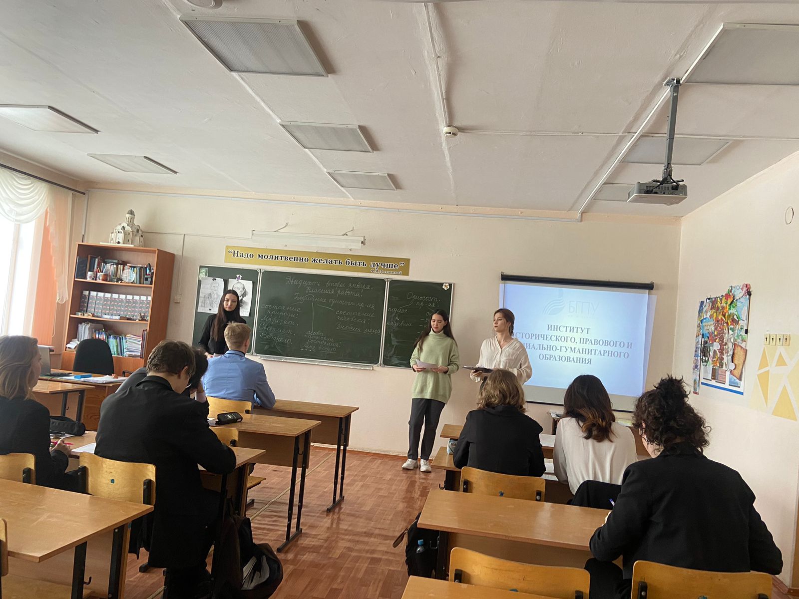 В МАОУ "Школа №113 имени героя Советского Союза Рыбалко Ивана Игнатьевича" в рамках прохождения педагогической практики было проведено профориентационное мероприятие со школьниками. Студенты 4 курса очного отделения профиль "Мировая художественная культура и экономика" Мурзина Дарья, Рыскулова Илюза и Туйгунова Эммилия рассказали о направлениях Института исторического, правового и социально-гуманитарного образования. Обучающиеся школы были проконсультированы относительно форм обучения, условий поступления, особенностей обучения, профессорско-преподавательского состава.
