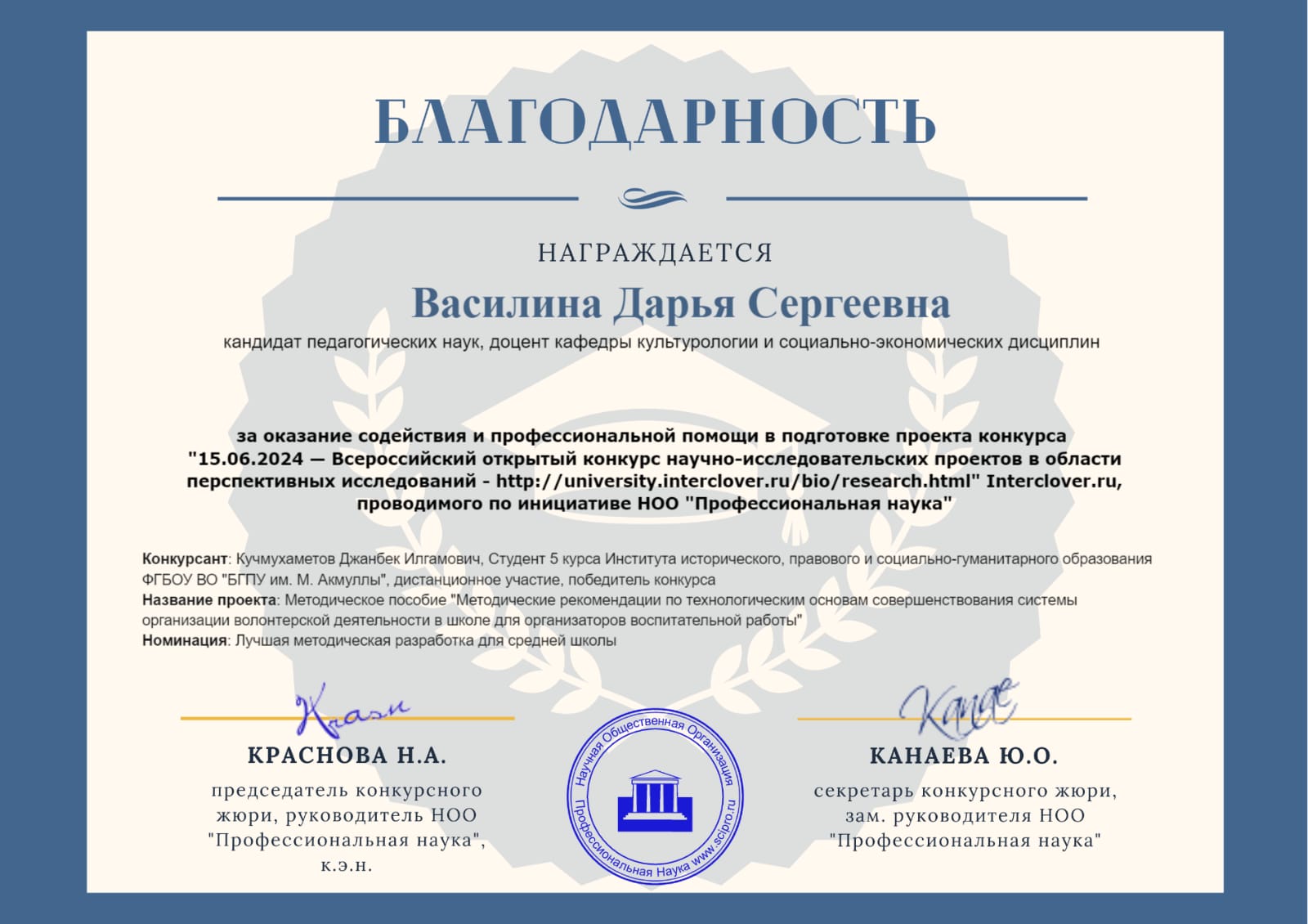 В Нижнем Новгороде прошел Международный конкурс научно-исследовательских проектов "Патриотическое воспитание: исследования и практики". Акмуллинский университет представлял проект Кучмухаметова Джанбека "Методические рекомендации по технологическим основам совершенствования системы организации волонтерский деятельности в школе" (научный руководитель Д.С.Василина). По результатам конкурса проект стал обладателем 1 места в номинации "Лучшая методическая  разработка для школы".