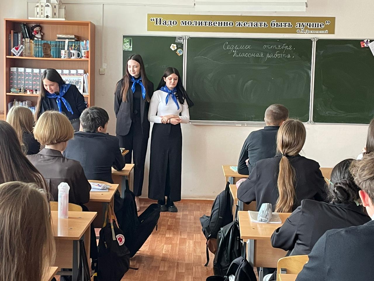 Студенты 5 курса профиля "Мировая художественная культура и экономика" в рамках педагогической практики провели профориентационное занятие для обучающихся 10 класса МАОУ "Школа №113 имени героя Советского Союза Рыбалко Ивана Игнатьевича". По ходу мероприятия Сальникова Мария, Рыскулова Илюза и Мурзина Дарья рассказывали учащимся о Башкирском государственном педагогическом университете имени М. Акмуллы, его историях и традициях, актуальных направлениях подготовки Института исторического, правового и социально-гуманитарного образования и студенческой жизни.