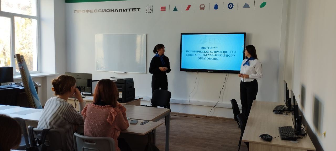 28 октября было проведено профориентационное мероприятие студентами 4 курса направления 44.03.04 Профессиональное обучение (по отраслям), профиль Экономика и управление кафедры культурологии и социально-экономических дисциплин Аминевой Нэркэс и Гаффаровой Алсу в Уфимском колледже отраслевых технологий для студентов 2 курса направления подготовки 46.02.01 Документационное обеспечение управления. Мероприятие проводилось в рамках прохождения практики. Обучающиеся колледжа просмотрели интересный видеоролик, прослушали информацию об условиях поступления, преподаваемых дисциплинах, профессорско-преподавательском составе. В конце мероприятия студенты задавали вопросы относительно учебного процесса вуза, содержании учебного плана, организации воспитательной деятельности и возможностях реализации творческого потенциала.