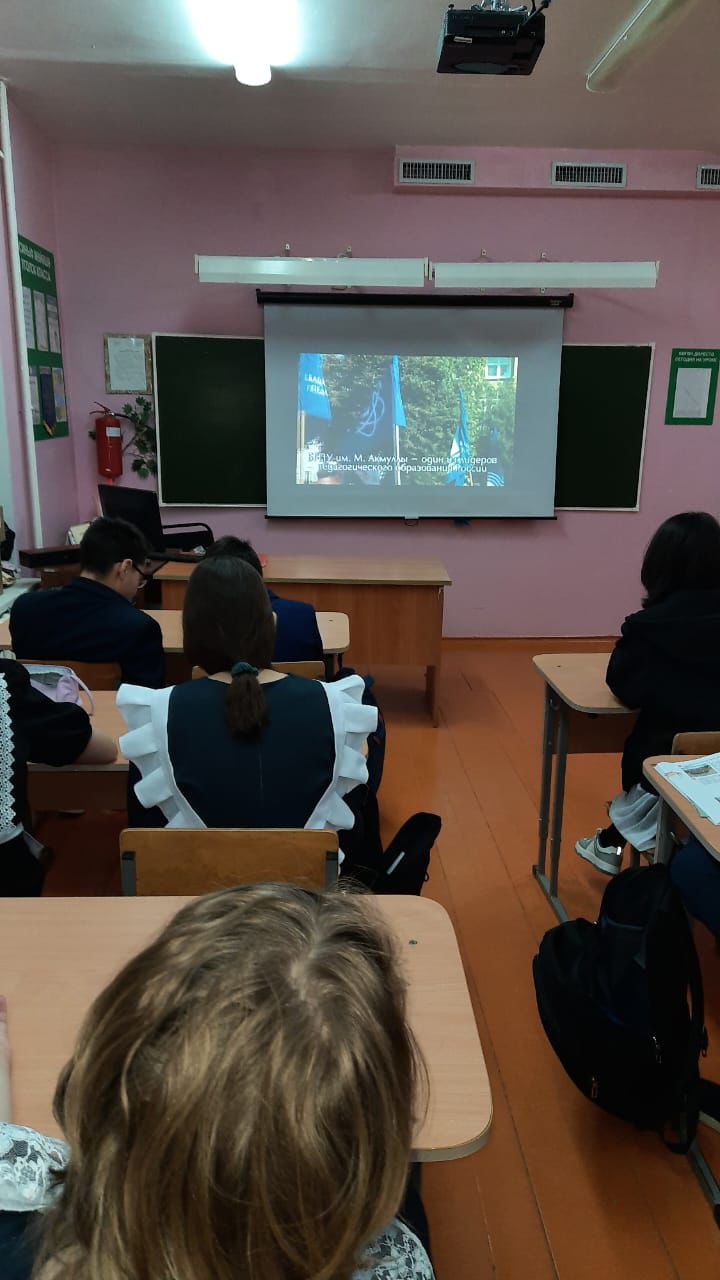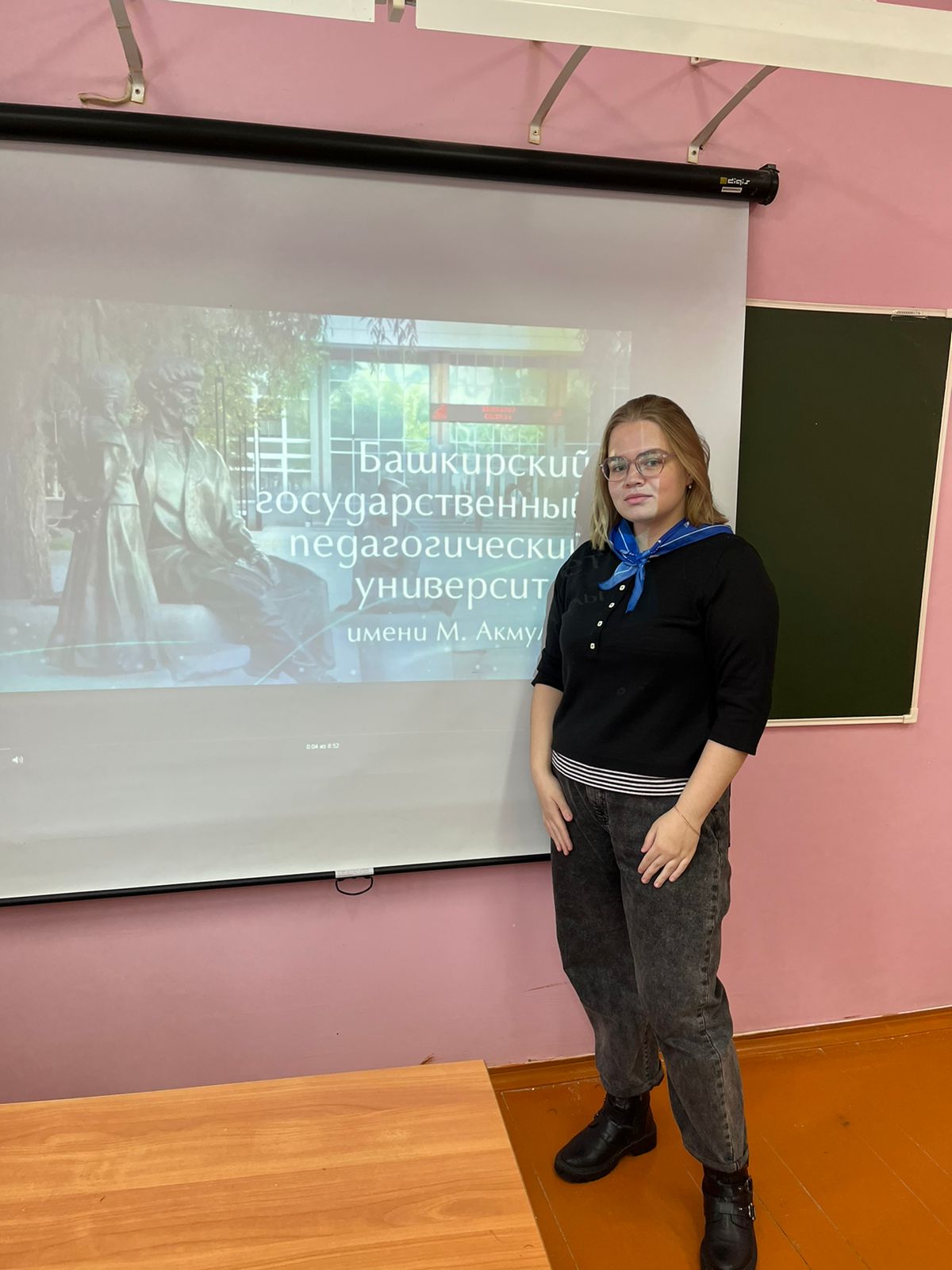 В рамках профориентационного мероприятия в МАОУ СОШ №1 поселка Чишмы Тулякова Е.О., студентка 4 курса профиля "Экономика и управление" ознакомила учеников 11 класса со спецификой Института исторического, правового и социально-гуманитарного образования. Ученики узнали об условиях поступления на различные направления обучения, активной студенческой жизни обучающихся института, конкурсах, праздниках, научных, культурно-досуговых, спортивных мероприятиях, проводимых в университете. Обучающиеся задавали вопросы относительно дисциплин по каждому из направлений, преподавателях, содержании обучения, условиях проживания в общежитии.