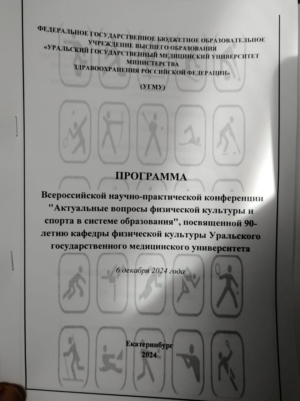 6 декабря в г.Екатеринбург на базе ФГБОУ ВО "Уральский государственный медицинский университет Министерства здравоохранения Российской Федерации" прошла Всероссийская научно-практическая конференция "Актуальные вопросы физической культуры и спорта в системе образования", посвященной 90-летию кафедры физической культуры. На конференции выступили с докладами д.п.н., профессор В.Л. Бенин и к.п.н., доцент Е.Д. Жукова.
