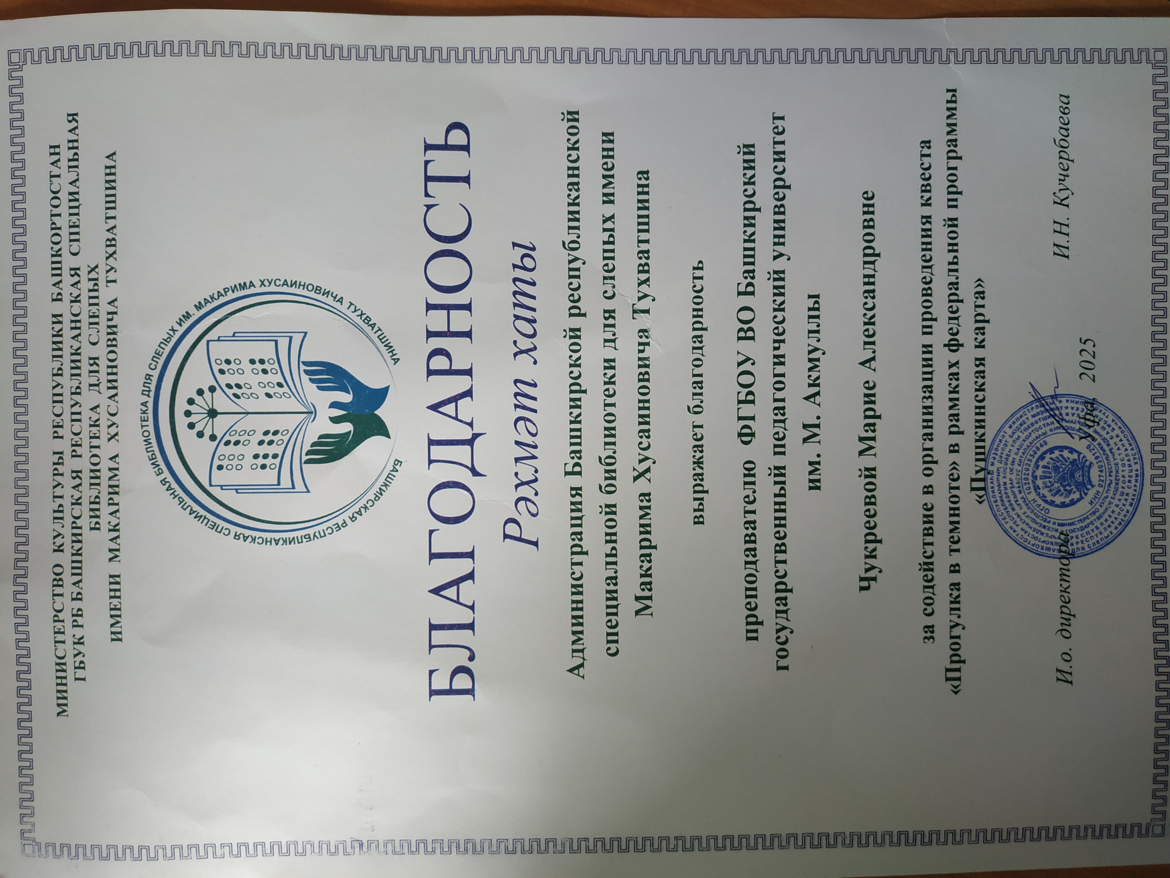 Администрация ГБУК РБ Башкирской республиканской специальной библиотеки для слепых имени Макарима Хусаиновича Тухватшина вручила старшему преподавателю М.А. Чукреевой благодарственное письмо за содействие в организации проведения квеста "Прогулка в темноте" в рамках федеральной программы "Пушкинская карта" и привлечение студентов к мероприятию.