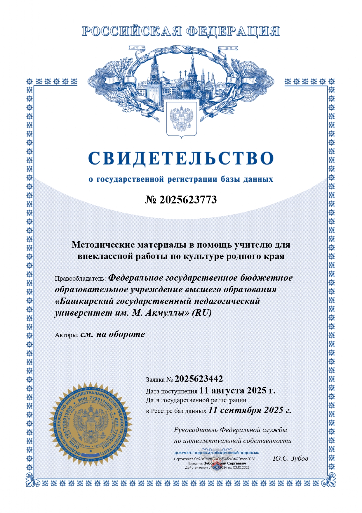 Коллективом профессорско-преподавательского состава кафедры культурологии и социально-экономических дисциплин (заведующий кафедрой, профессор В.Л.Бенин, доцент Д.С.Василина, доцент Е.Д.Жукова, доцент С.В.Рябова) и студентами-выпускниками направления 44.03.05 Педагогическое образование (с двумя профилями подготовки), направленность (профиль) Мировая художественная культура и экономика получено свидетельство о государственной регистрации базы данных "Методические материалы в помощь учителю для внеклассной работы по культуре родного края".