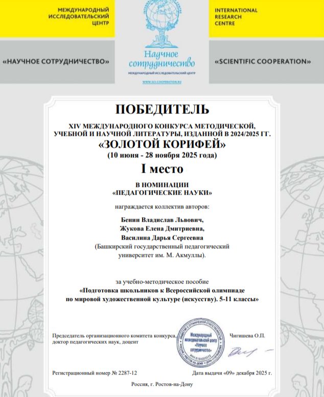 9 декабря 2025 г. в г. Ростове на Дону были подведены итоги Международного конкурса методической, учебной и научной литературы «Золотой Корифей». В нем приняли участие 52 автора и авторских коллектива, представивших для конкурсного рассмотрения издания, опубликованные в 2024 и 2025 гг. В номинации «Педагогические науки» по направлению «Методическая литература» 1 место было присуждено авторскому коллективу кафедры культурологии и социально-экономических дисциплин (Владислав Львович Бенин, Елена Дмитриевна Жукова, Дарья Сергеевна Василина) за учебно-методическое пособие «Подготовка школьников к Всероссийской олимпиаде по мировой художественной культуре (искусству). 5-11 классы», вышедшему в издательстве БГПУ.