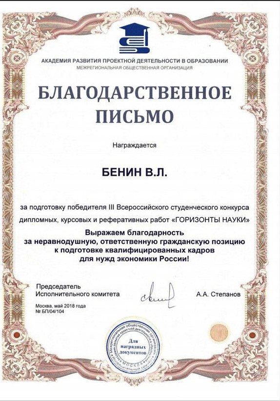 За успехи студента – призёра конкурса, неравнодушную, ответственную гражданскую позицию в подготовке квалифицированных кадров для нужд экономики России он был отмечен Благодарственным письмом Академии развития проектной деятельности в образовании.