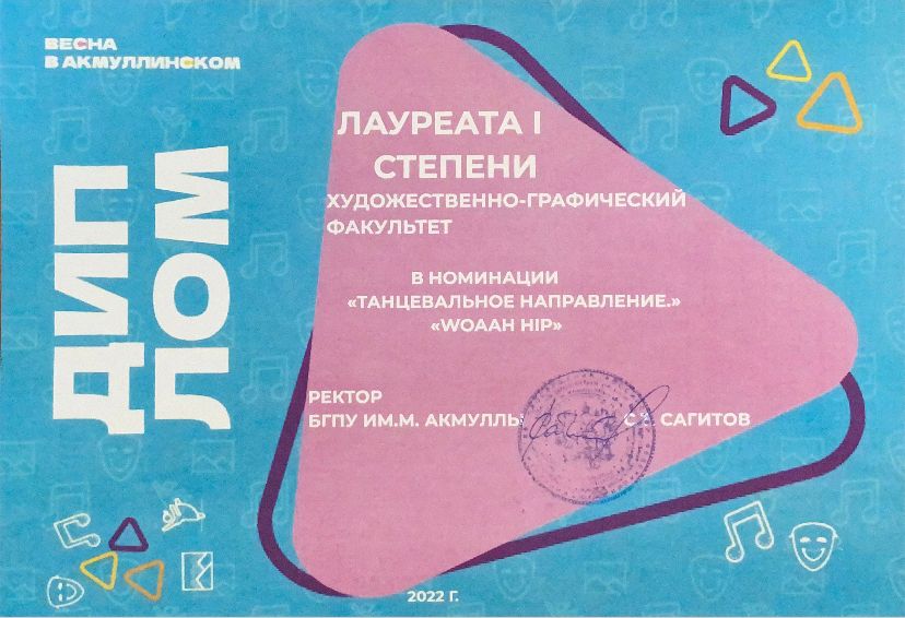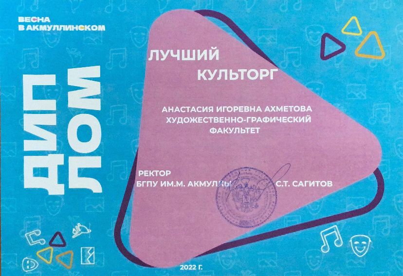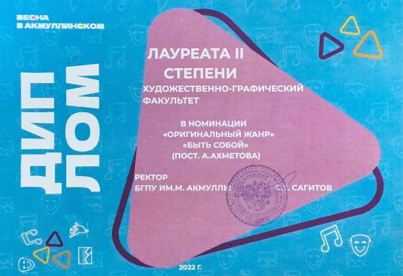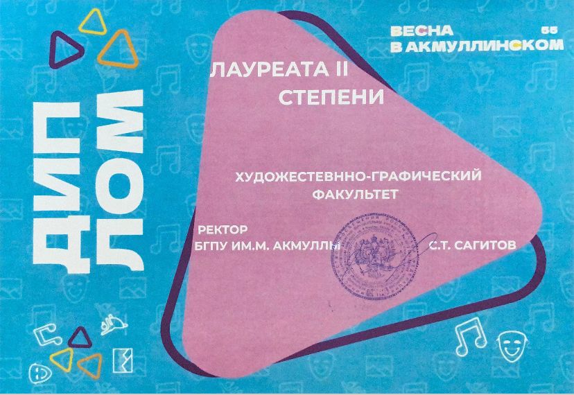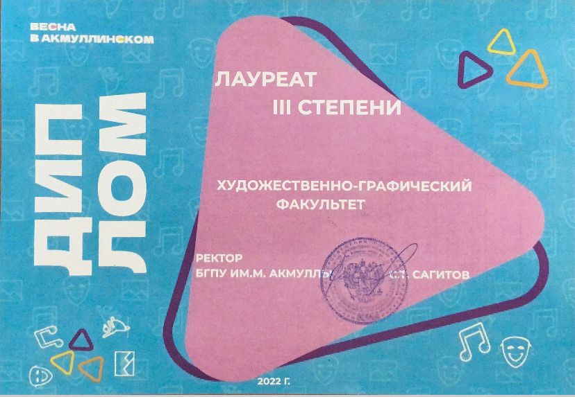По итогам Гран-при фестиваля «Студенческая весна в Акмуллинском – 2022» художественно-графический факультет получил диплом III степени.