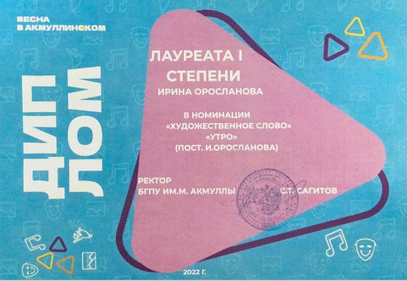 Диплом I степени – Ирина Оросланова, в номинации «Художественное слово».
