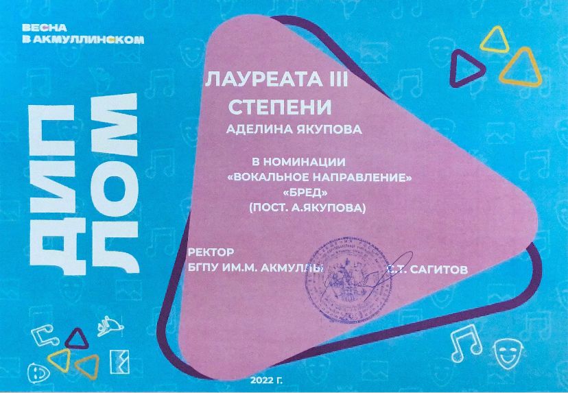 Диплом III степени в номинации «Вокальное направление» «Бред» (постановщик А.Якупова).