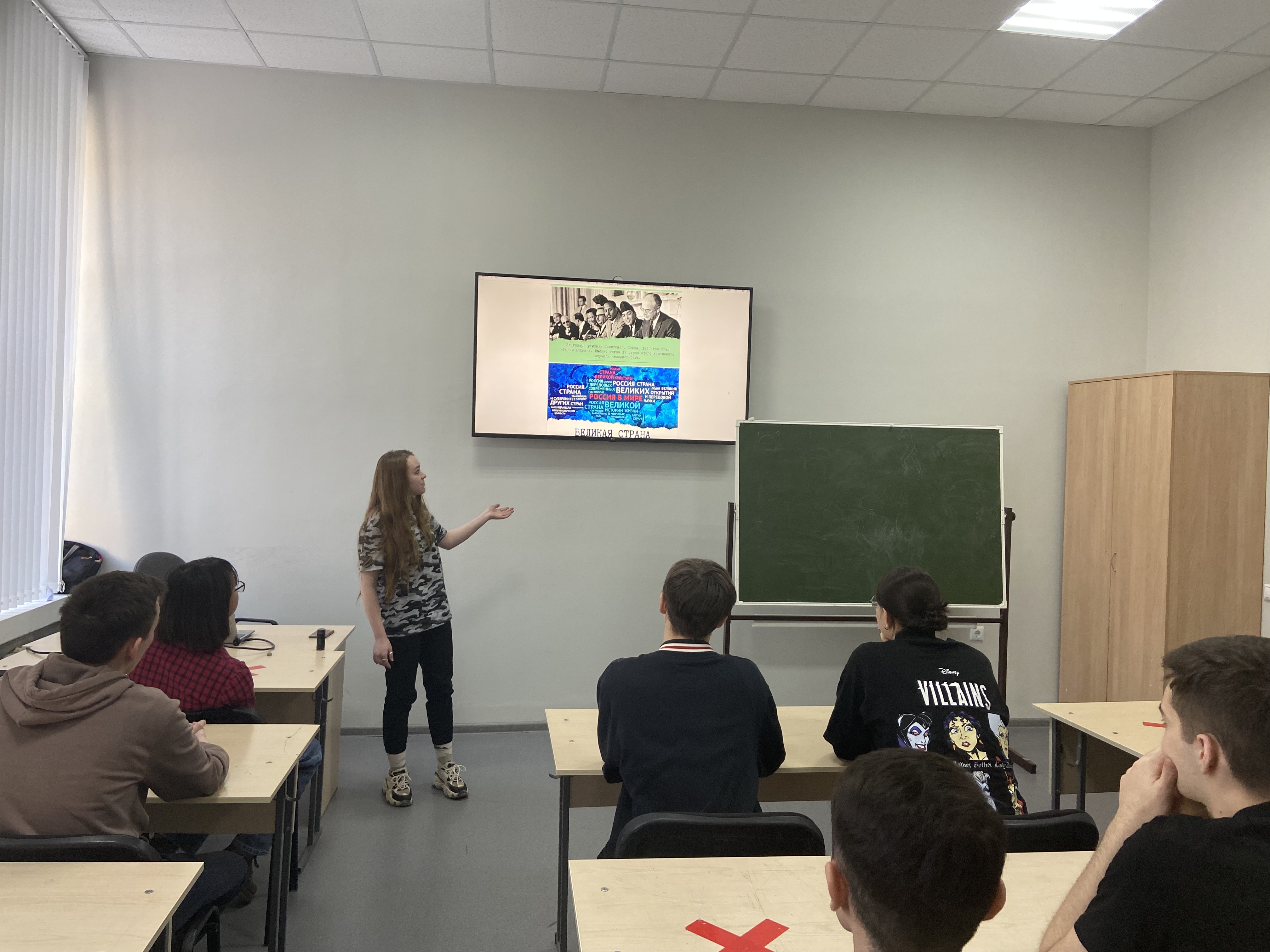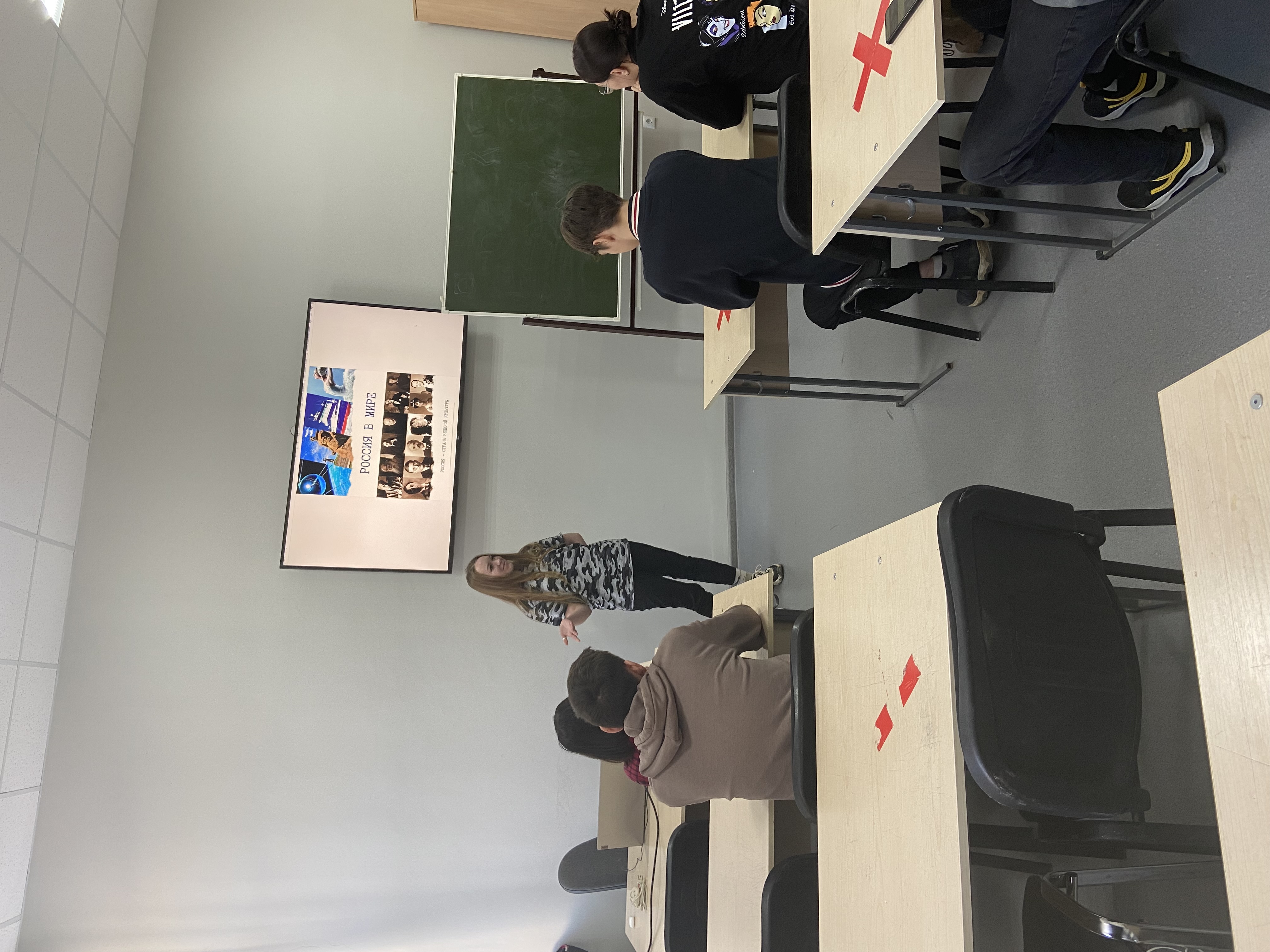 13 февраля 2023 года проведено мероприятие в рамках Федерального проекта «Разговоры о важном». Тема мероприятия: «Россия в мире». Мероприятие провела студентка, член студенческого актива. Был организован просмотр презентации по предложенной теме, обсуждение особо важных вопросов и подведение итогов. В презентации представлены великие российские писатели, поэты, исследователи, первооткрыватели, ученые. В качестве итогов было озвучено, что Россия страна великой культуры, внесла исключительный вклад в создание общепризнанной художественной культуры, вклад в мировую науку и подарила миру много открытий российских ученых.