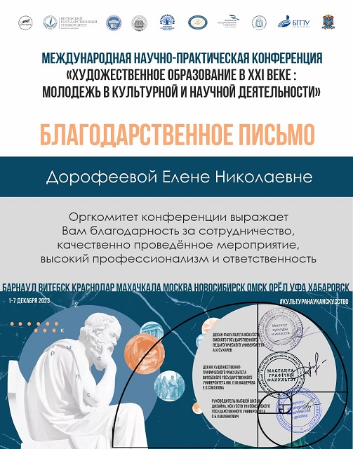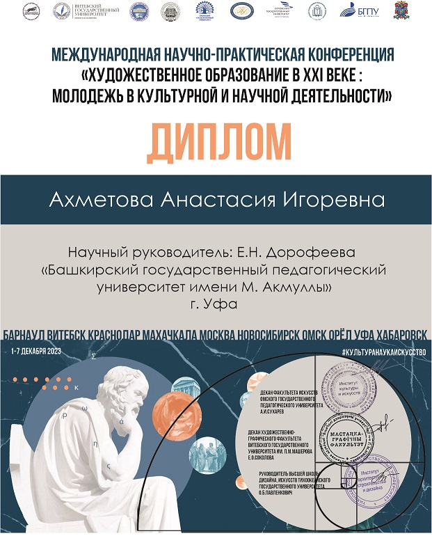 Руководителями докладов от художественно-графического факультета Акмуллинского университета стали декан, к.п.н., доцент Е.В. Плотникова и к.п.н., доцент Е.Н. Дорофеева. С докладами выступили Анастасия Ахметова – студентка направления «Дизайн», и Валентина Матвеева – магистрант направления «Коммуникативный дизайн».