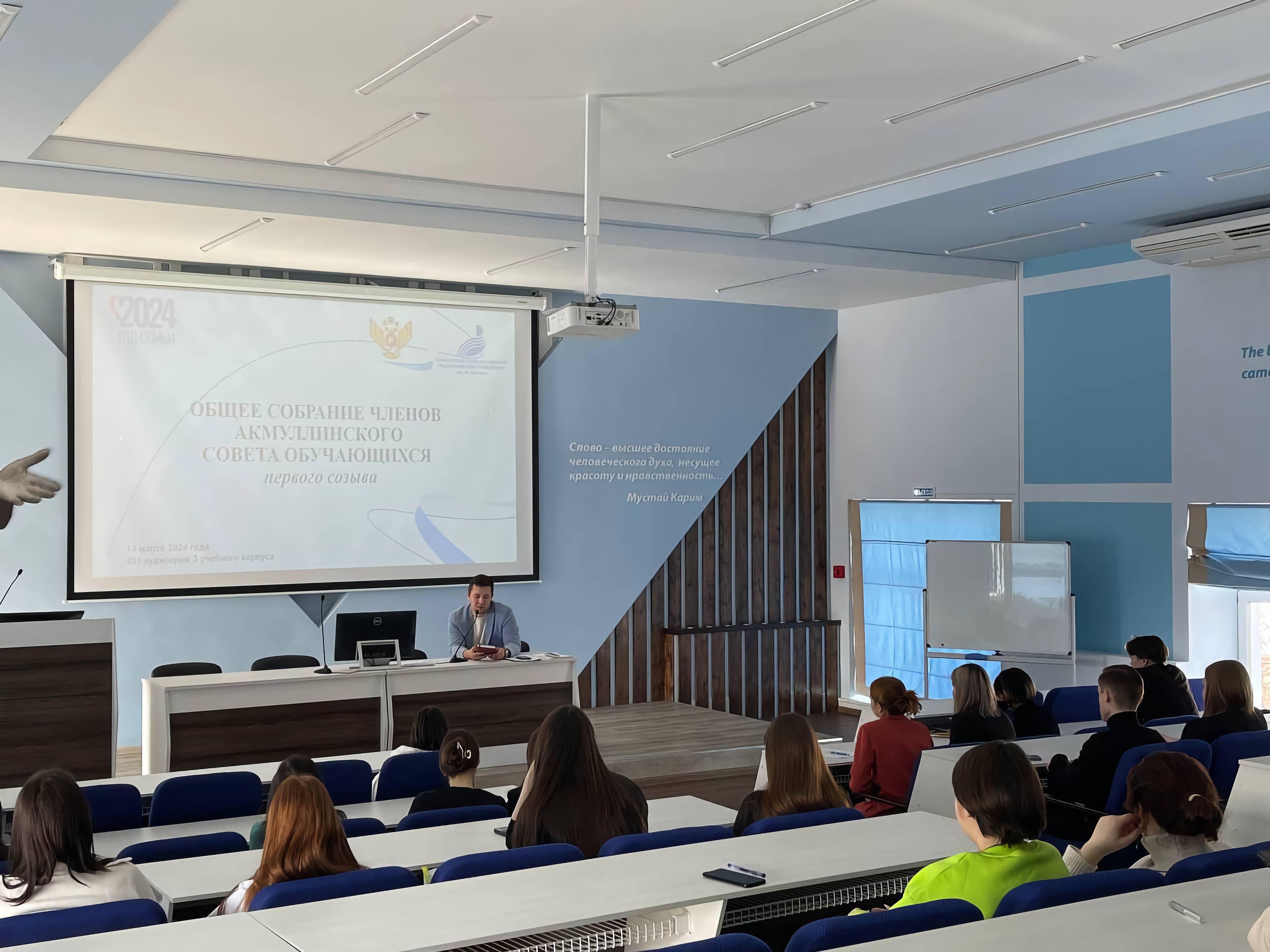 Для выборов нового органа студенческого самоуправления собрались представители всех объединений Акмуллинского университета – председатели студенческих советов учебных подразделений, председатели студенческих советов общежитий, а также руководители студенческих объединений (творческих, спортивных, волонтерского центра, профсоюзного комитета, РДДМ, патриотического клуба и др.).