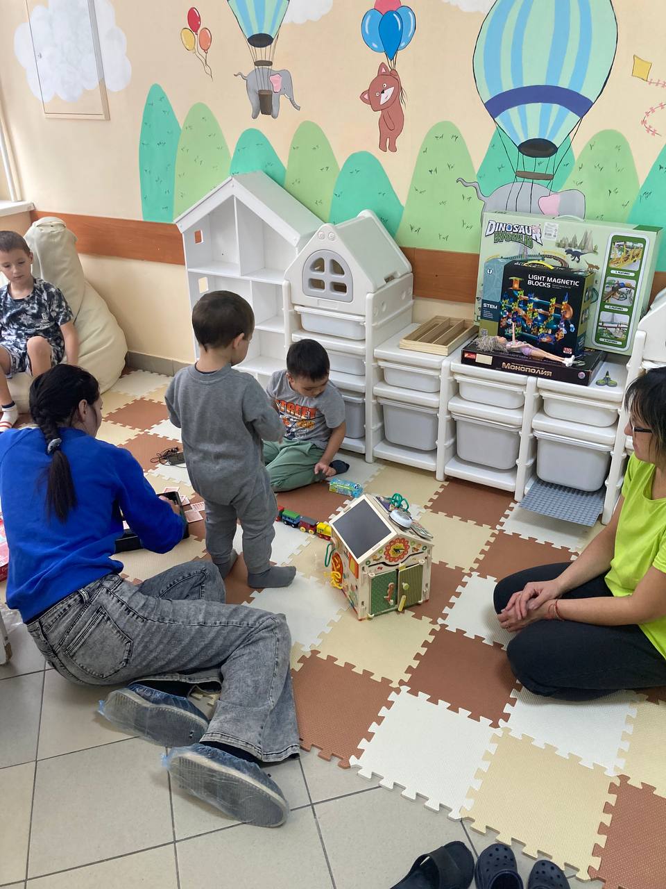 Игровая находится в общем холле двух отделений – неврологии и паллиативной помощи. Пространство оборудовано прочной и стильной детской мебелью, легкими креслами-пуфами, которые можно перемещать. Вместительные ящики хранят в себе игрушки для детей разного возраста и с разными ментальными и физическими способностями: логические игры и сортеры, магнитные мозаики, крупные конструкторы, куклы, машинки, настольные игры для детей старшего возраста.