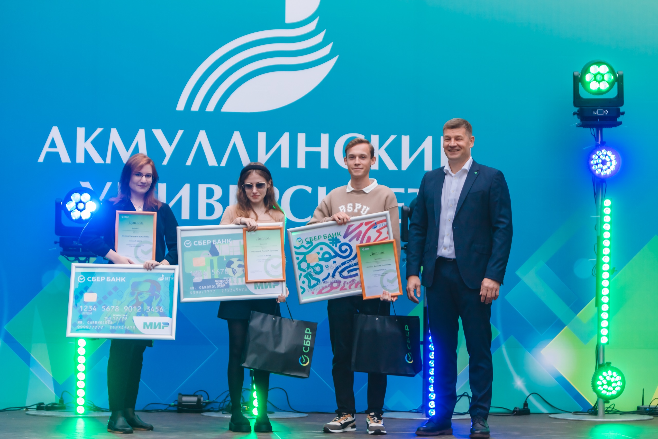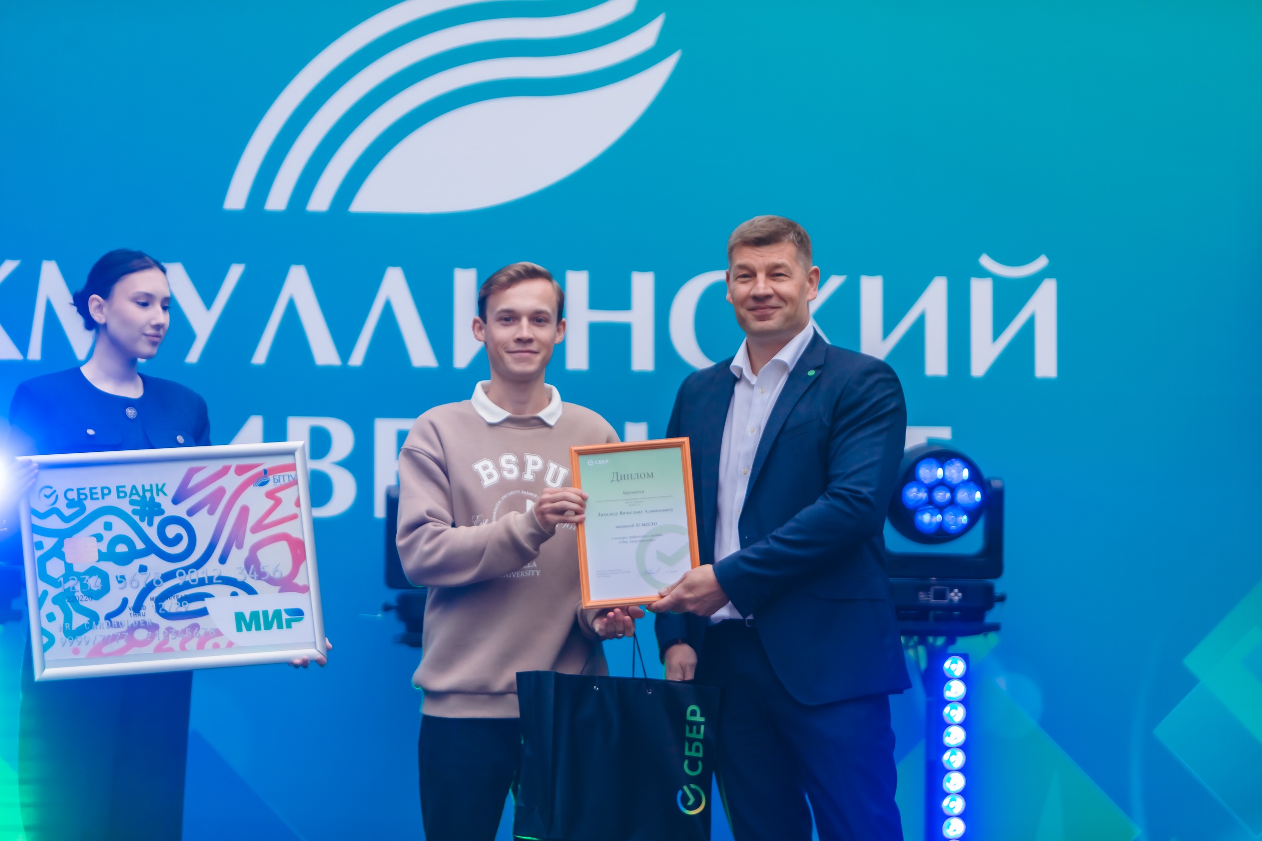 На торжественном мероприятии, посвященном Дню знаний и началу учебного года, состоялось награждение студентов Башкирского государственного педагогического университета им. М. Акмуллы, ставших победителями открытого конкурса «Сбер – Акмуллинскому». Конкурс был организован  Башкирским отделением «Сбербанк» совместно с университетом. Его участникам было предложено создать концепцию проекта банковской карты для студента.