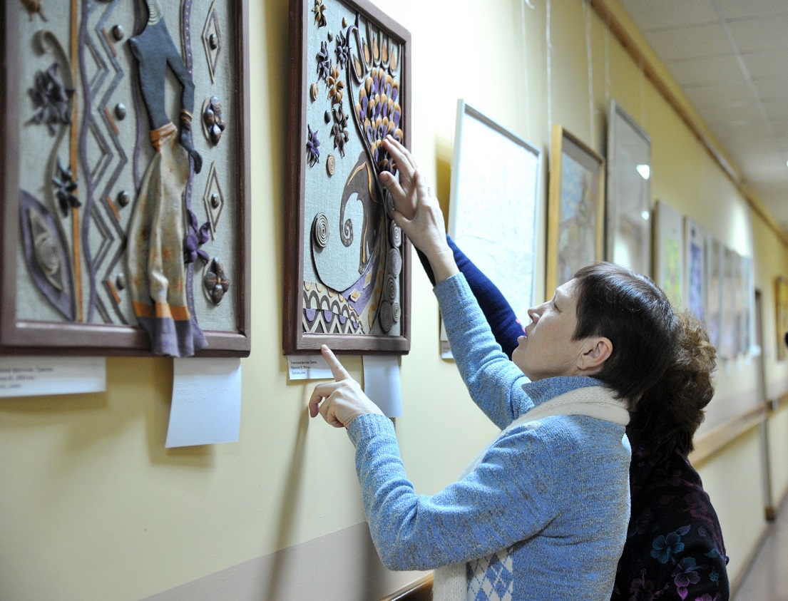Уникальность выставки состоит в том, что экспонируемые работы можно не только рассматривать, но и трогать руками, что актуально для людей с нарушениями зрения. В экспозиции представлены витражная роспись стекла, линогравюра, художественный текстиль, рельеф, художественная обработка кожи и бумаги и др.
