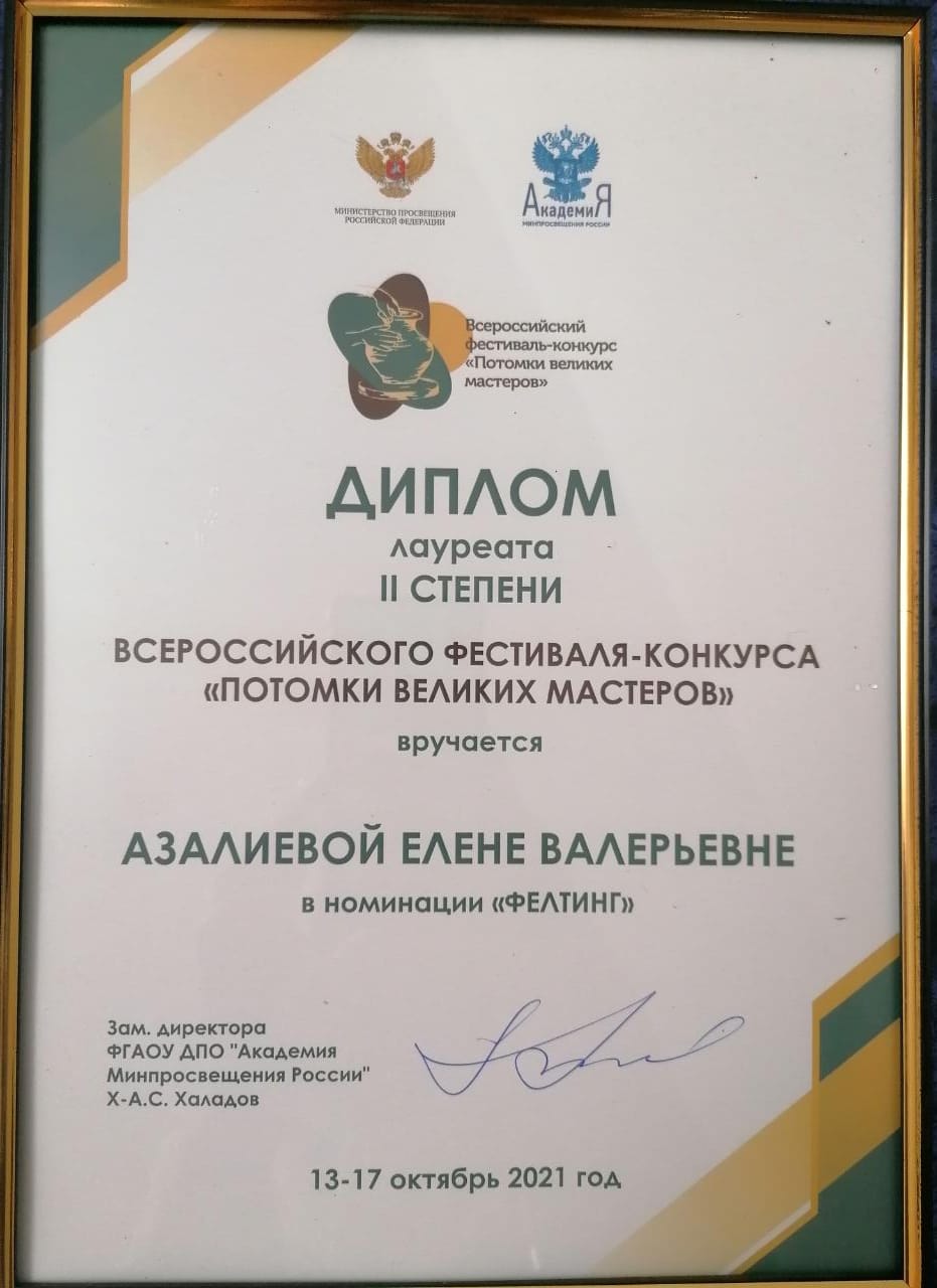 Студентка художественно-графического факультета, магистрантка 2 курса Азалиева Елена получила диплом лауреата 2 степени в номинации "Фелтинг". На очном этапе фестиваля-конкурса было представлено панно «Тишина. Акмулла» (художественный войлок). В ходе конкурсного испытания Елена выполнила и представила публике и жюри свою работу "Родная сторона - золотая колыбель", выполненную также в технике художественного войлока (фелтинг).