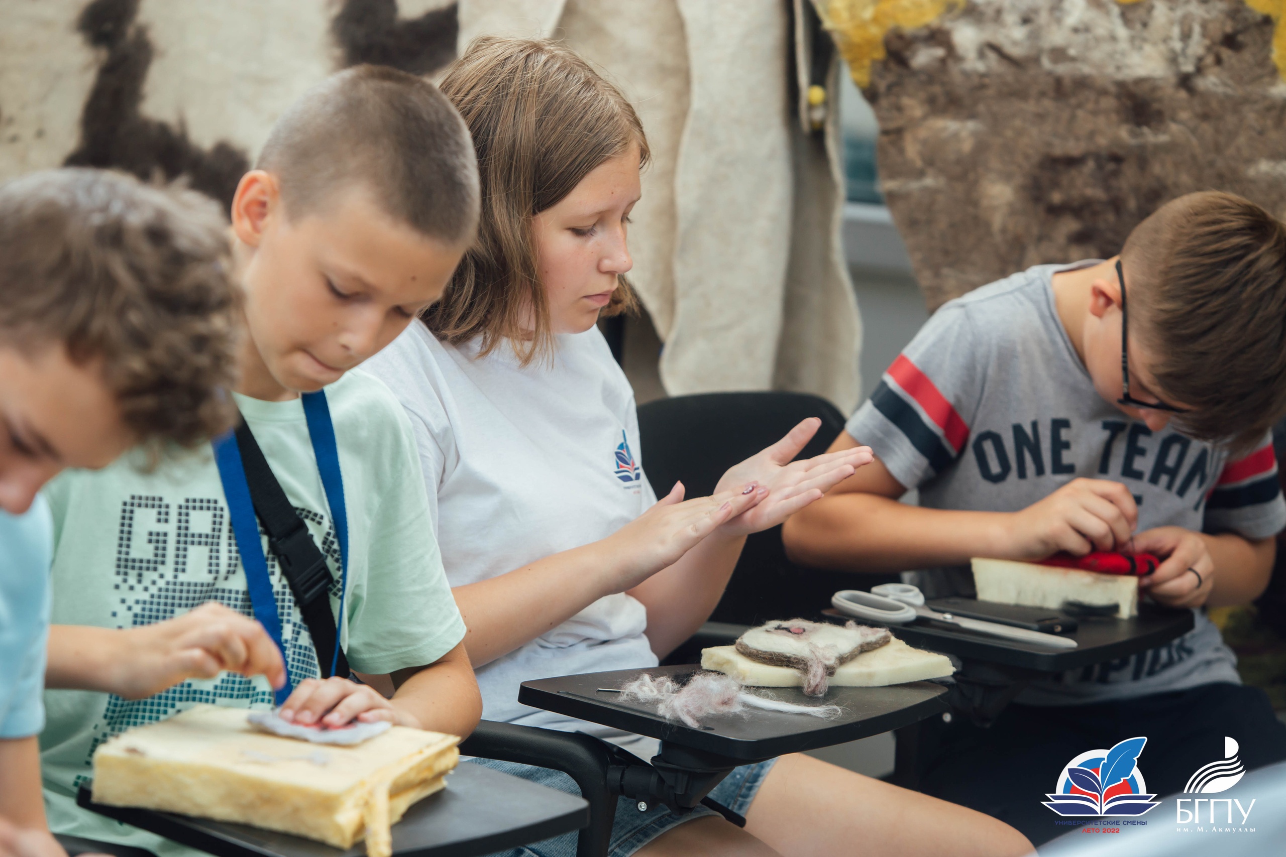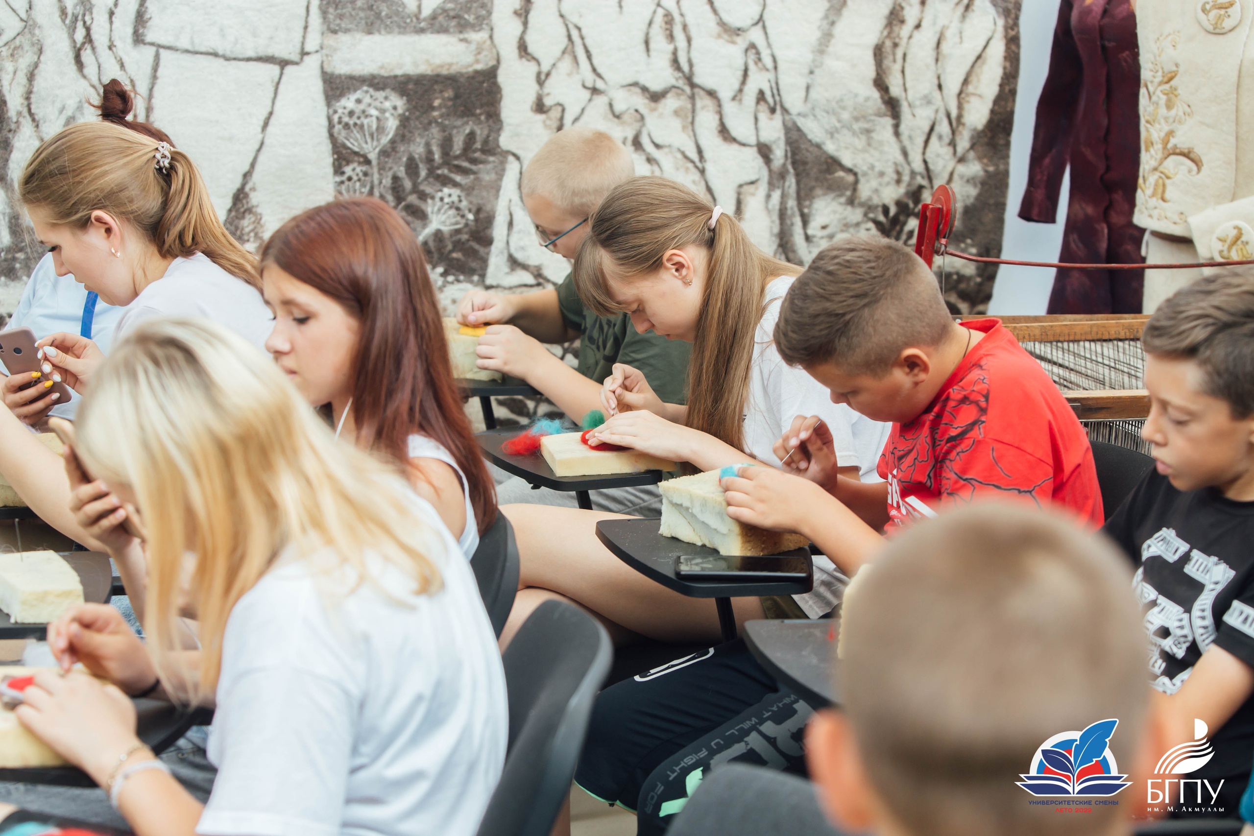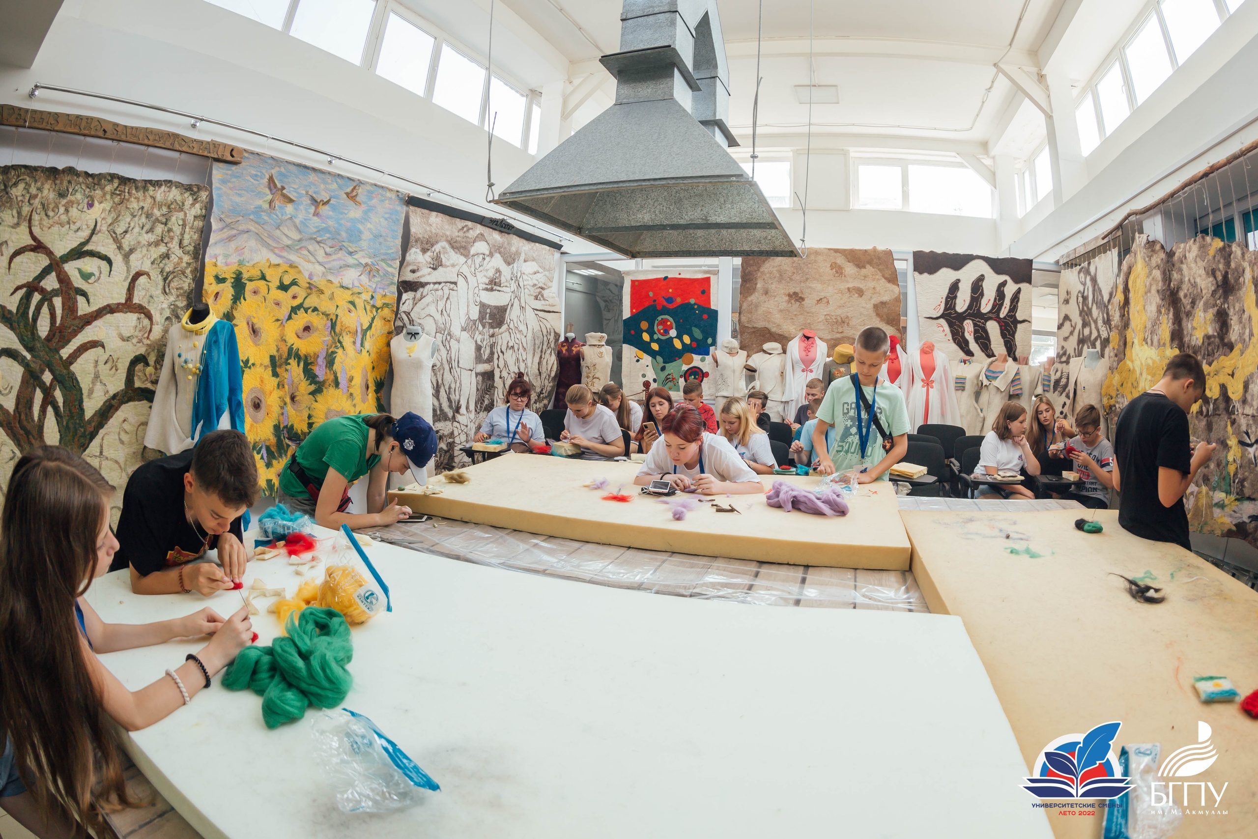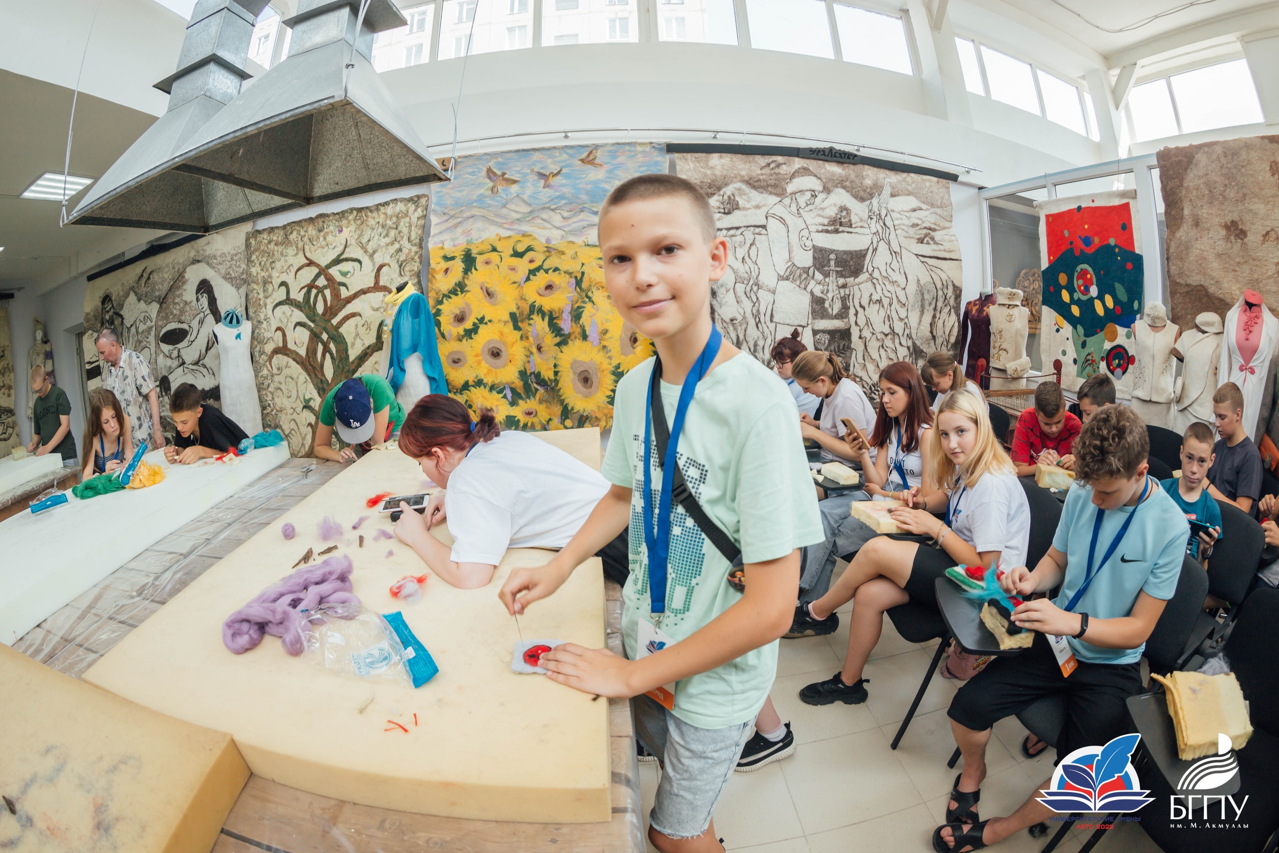 10 июля ребята посетили Центр художественного войлока БГПУ им. М.Акмуллы. Приветствовал участников смены руководитель подразделения Талгат Масалимов. Он ознакомил детей с декоративными панно, костюмами и объемными арт-объектами, представленными в Центре. Все экспонаты выполнены студентами художественно-графического факультета с использованием различных техник и приемов обработки шерсти.