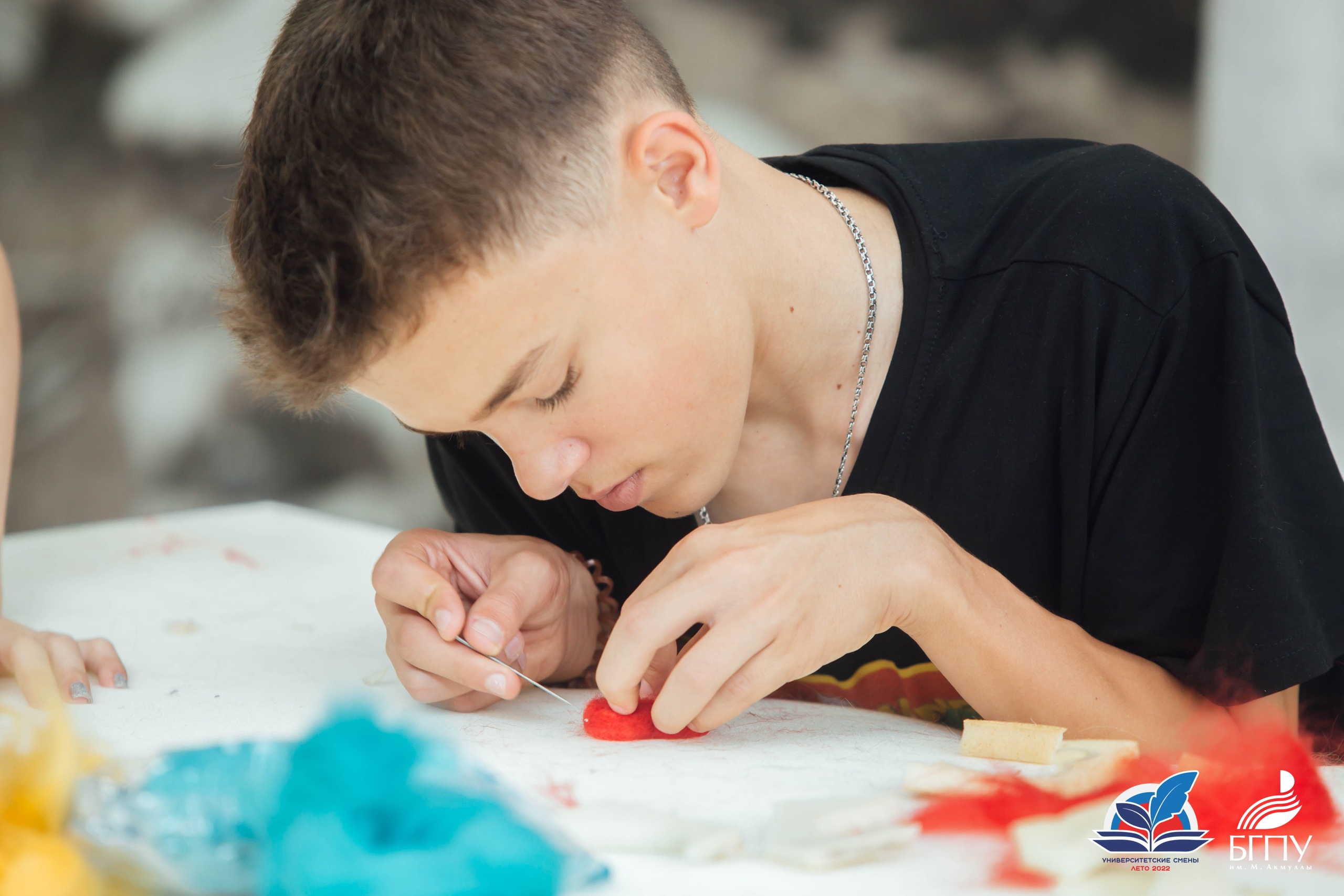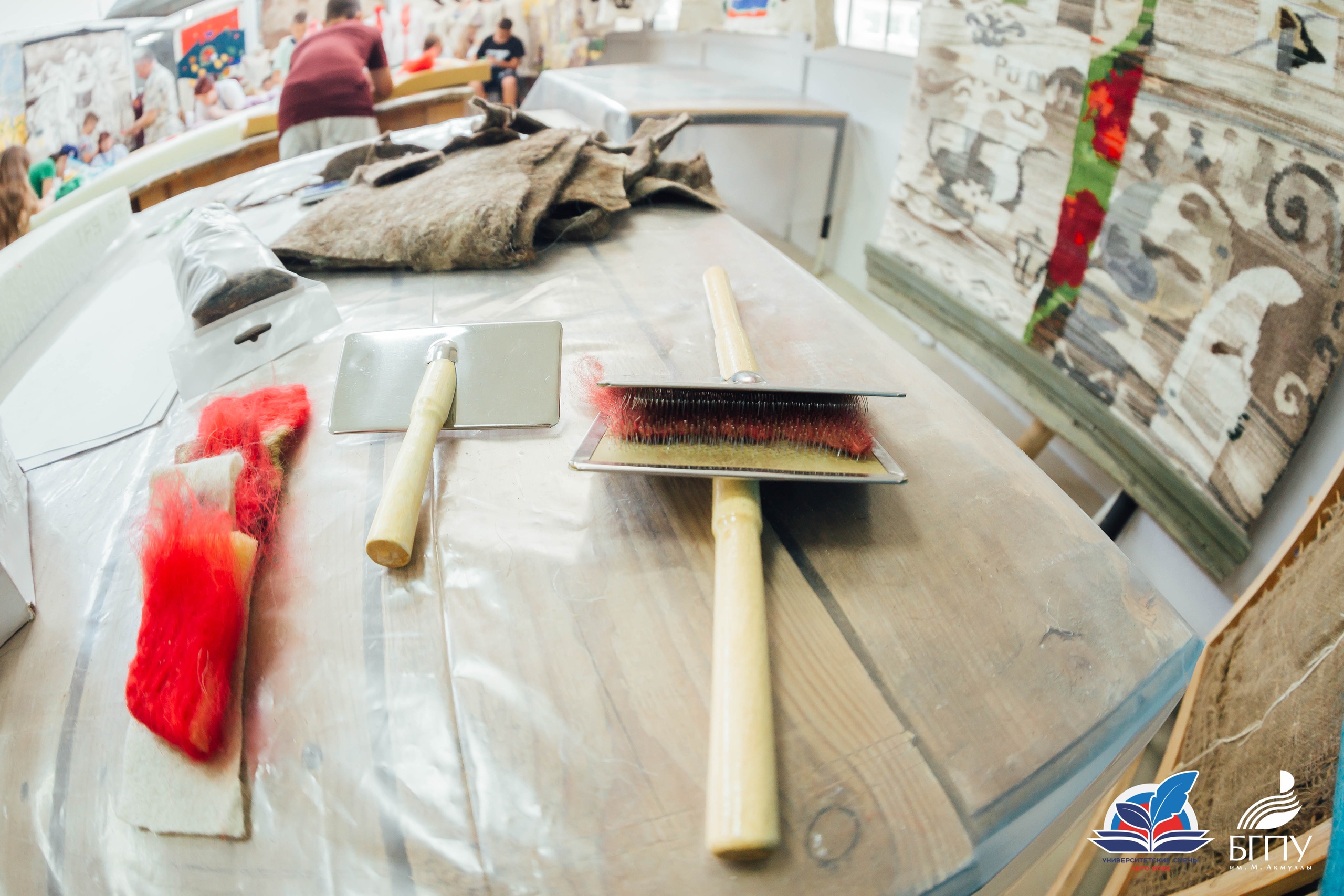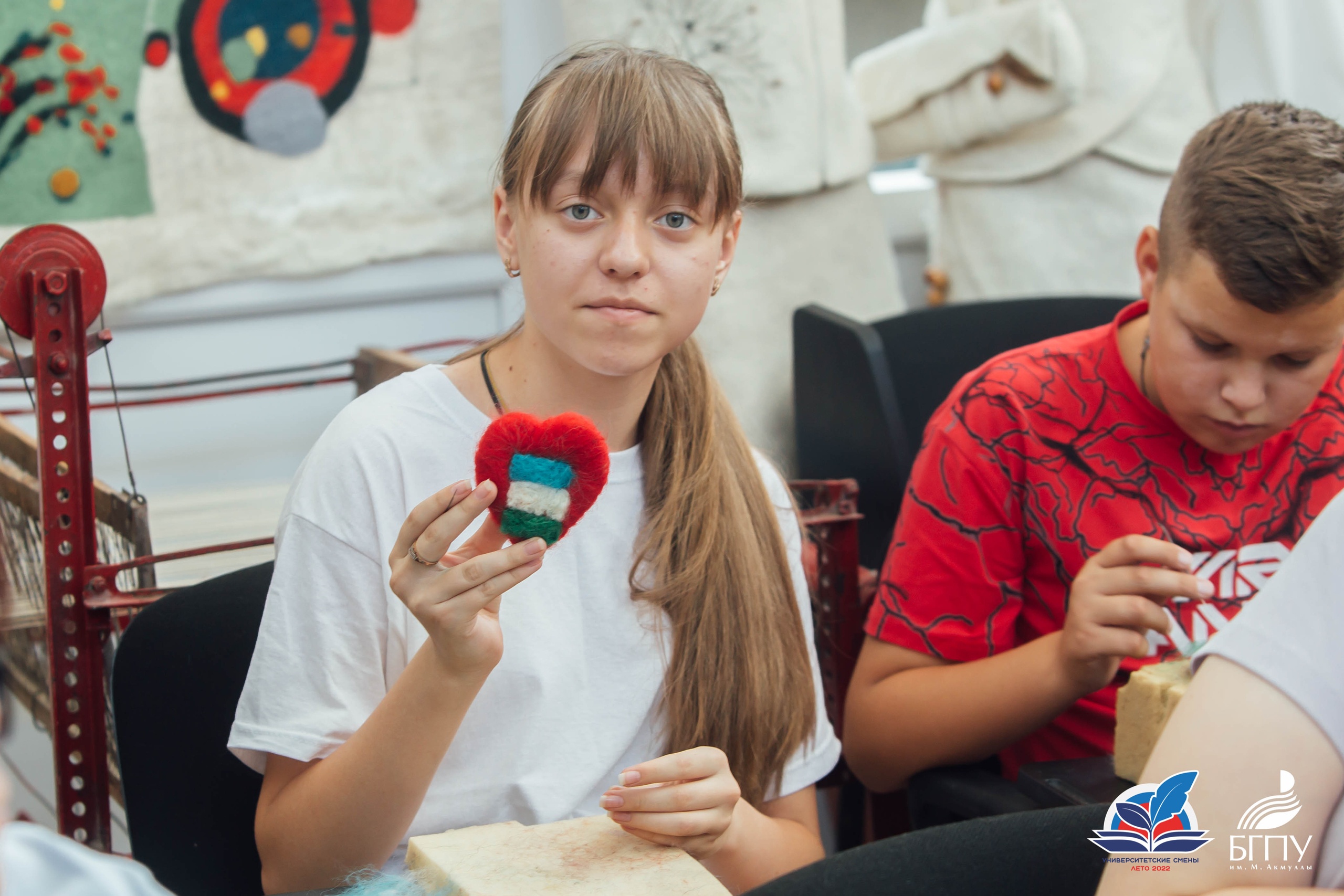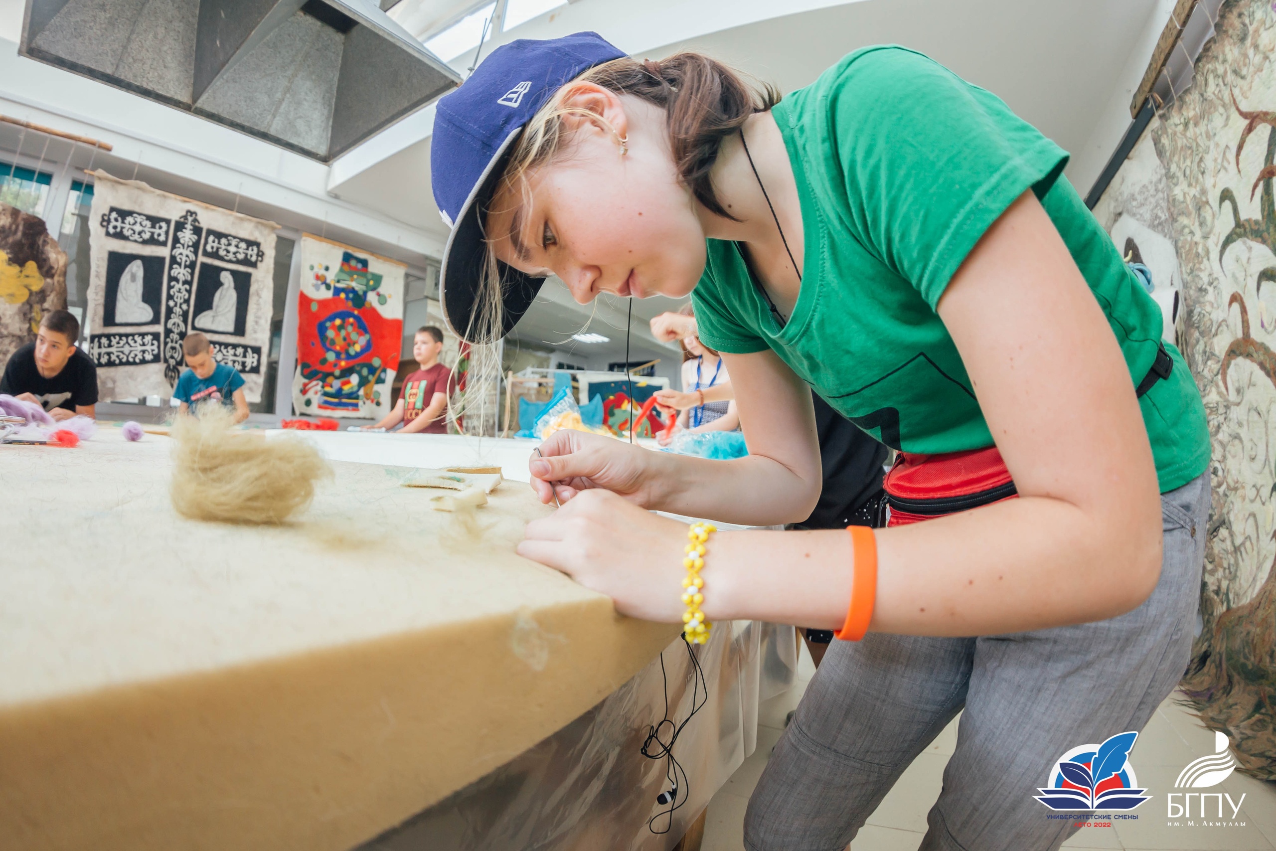 10 июля ребята посетили Центр художественного войлока БГПУ им. М.Акмуллы. Приветствовал участников смены руководитель подразделения Талгат Масалимов. Он ознакомил детей с декоративными панно, костюмами и объемными арт-объектами, представленными в Центре. Все экспонаты выполнены студентами художественно-графического факультета с использованием различных техник и приемов обработки шерсти.