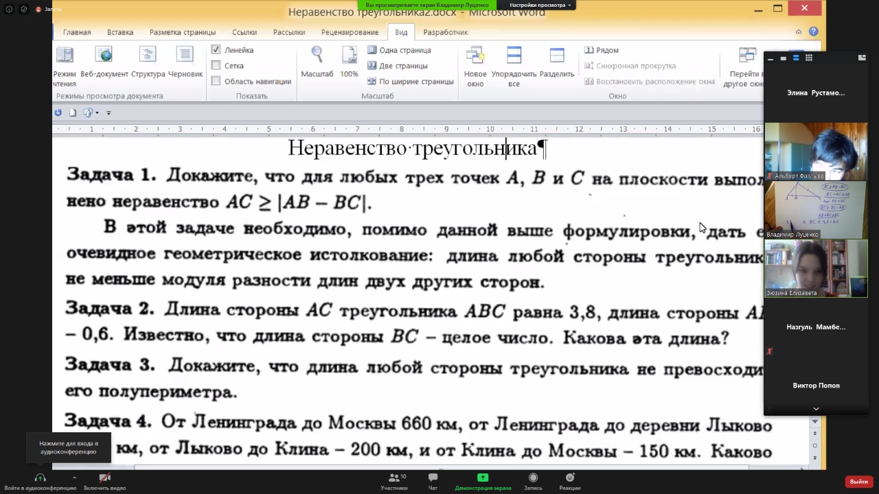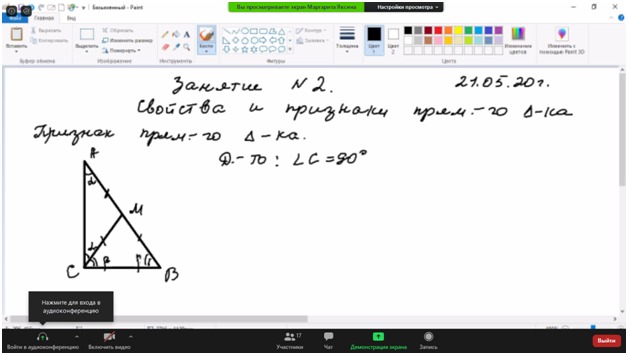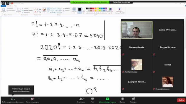 С 7 по 28 мая 2020 года «Научно-образовательный центр современных математических исследований» при БГПУ им. М. Акмуллы организовал дистанционные занятия по математике для 7-8 классов. Занятия проводились еженедельно (по четвергам) с 15.30 до 17.30 в онлайн-режиме в системе видеоконференцсвязи ZOOM.US. В связи с большим количеством желающих посещать эти уроки, были организованы 4 учебные группы: 2 группы для семиклассников и 2 – для восьмиклассников. Основная тематика онлайн уроков касалась теории чисел (теория делимости) и планиметрии (свойства треугольников и окружностей), уровень материала был рассчитан на достаточно мотивированных и способных школьников.