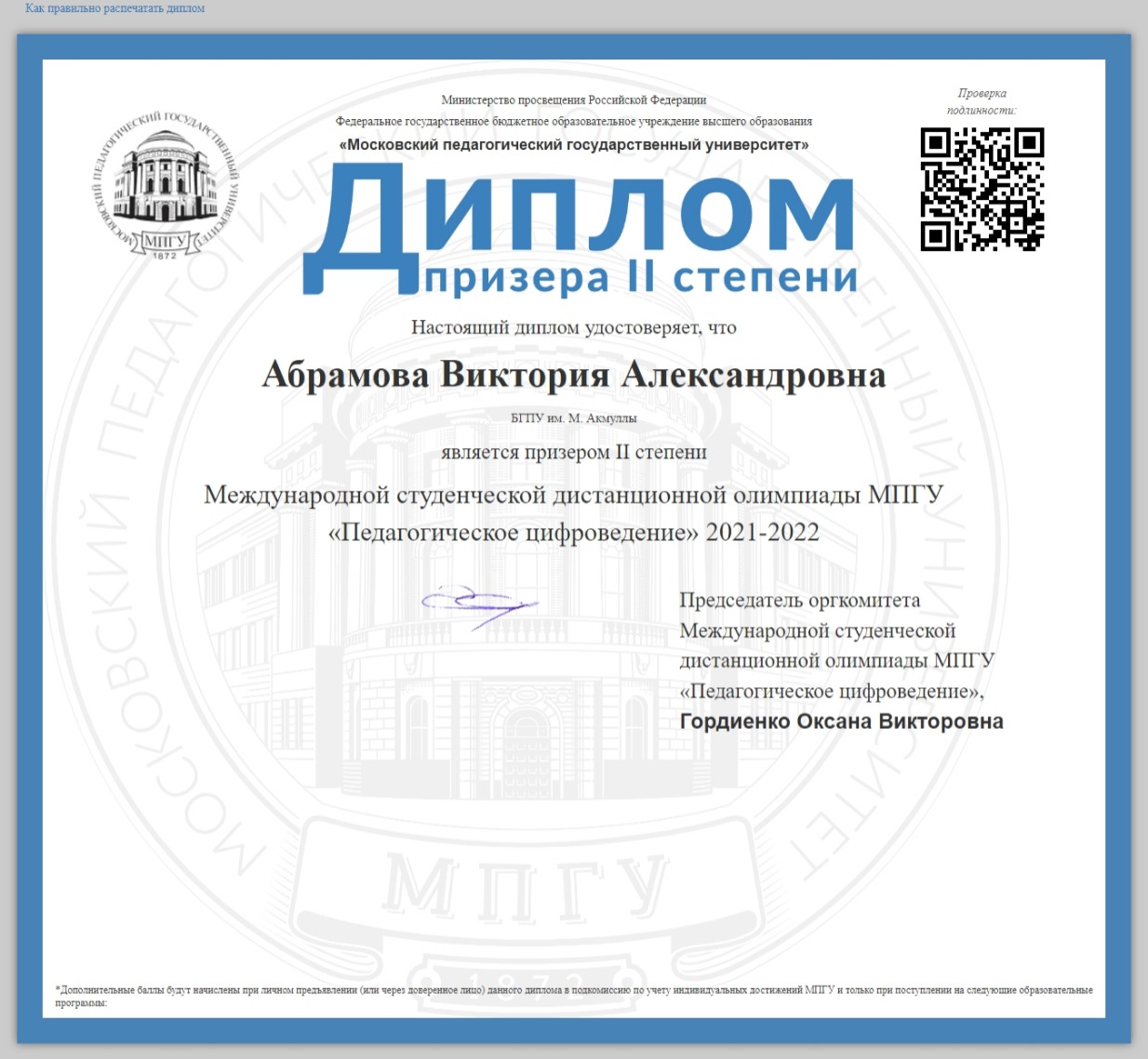 С 01 марта по 30 мая  2022 г. прошла Международная студенческая дистанционная олимпиада МПГУ «Педагогическое цифроведение». Олимпиада ставит перед собой задачу выявить творческих, креативных студентов, готовых использовать цифровые технологии в соответствии с целями и задачами учебной деятельности.