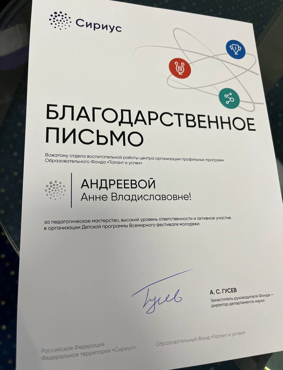 Вот и подошёл к концу Всемирный фестиваль молодежи на федеральной территории «Сириус», но в его рамках прошла детская программа, где студентка Андреева Аня стала одним из организаторов!