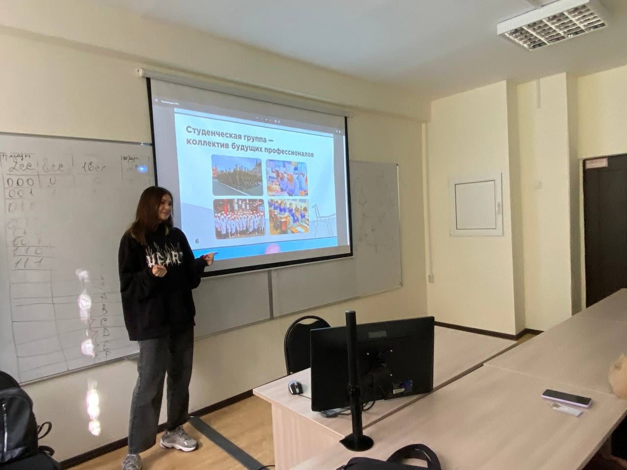 9 октября состоялась рубрика "Разговоры о важном". Ведущей, объяснявшей новую тему, стала Закирова Айсылу, студентка ИВТКТ-31-21. Она проводила урок со студентами группы ИСИТ-11-23. Они разговаривали о взаимоотношениях в коллективе. Ребятам рассказали про отношения к учебной группе как к первому профессиональному коллективу. Студентам напомнили о значимости взаимоуважения и взаимопомощи в становлении своего студенческого коллектива.