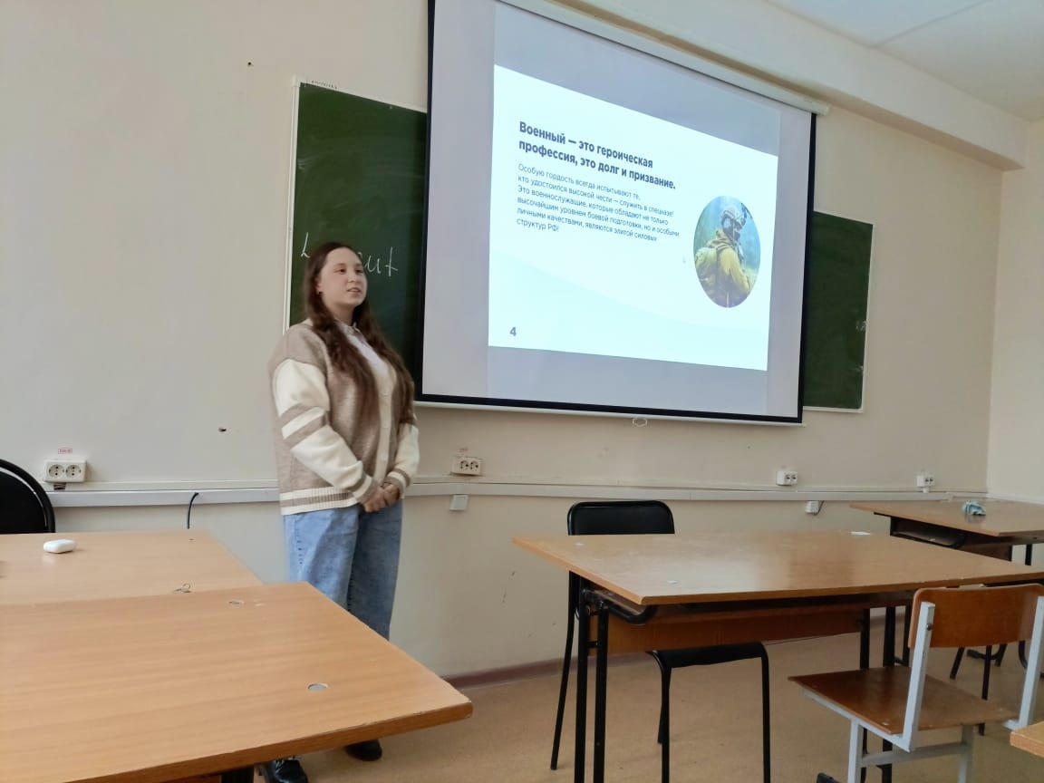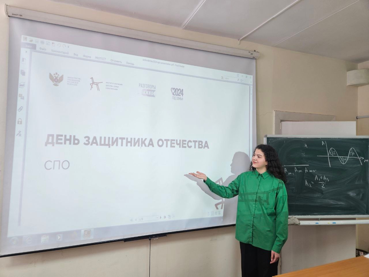 Беседа была посвящена дню защиты Отечества. Ведущая помогла разобраться студентам в том, кого причисляют к защитникам Отечества. А также рассказала кто для них является крепким тылом. К тому же Светлана помогла вспомнить учащимся фонды и комитеты, деятельность которых направлена на оказание адресной помощи военнослужащим.