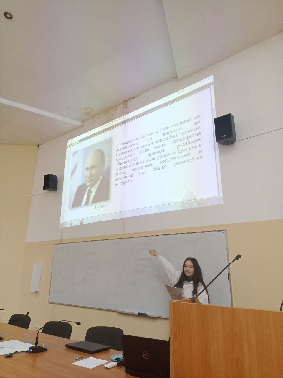 29 января была проведена рубрика "Разговоры о важном". Ведущая данного мероприятия стала студентка ПОМ_ИНФ-11-23 Салихова Альбина. Беседа была проведена со студентами групп ЭИН_ПЭИС_11-23, ИСИТ-11-23 и ПМФ-11-23. Беседа была посвящена союзникам России. Ведущая помогла вспомнить студентам союзы и объединения стран, а также для чего они создавались.