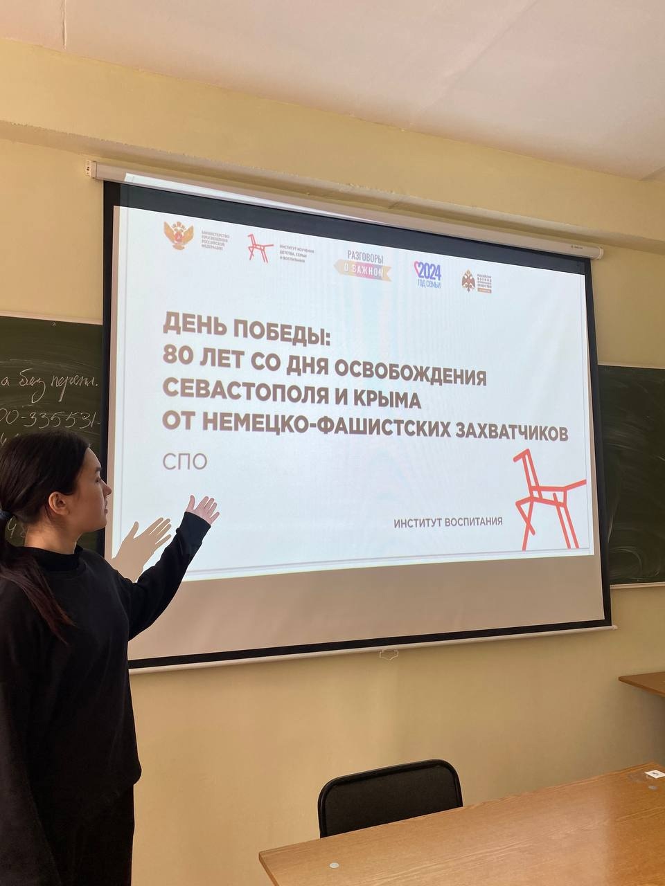 13 мая была проведена рубрика "Разговоры о важном". Ведущим данного мероприятия стал студент ПОМ_ИНФ-11-23 - Ибрагимова Камилла. Беседа была проведена со студентами группы ПОМ_ИНФ-11-23. Беседа была посвящена прошедшему Дню Победы: 80 лет со дня освобождения Севастополя и Крыма от немецко-фашистских захватчиков. Студентам напомнили о памятных датах, а также о сооружениях, которые были построены в честь Дня Победы.
