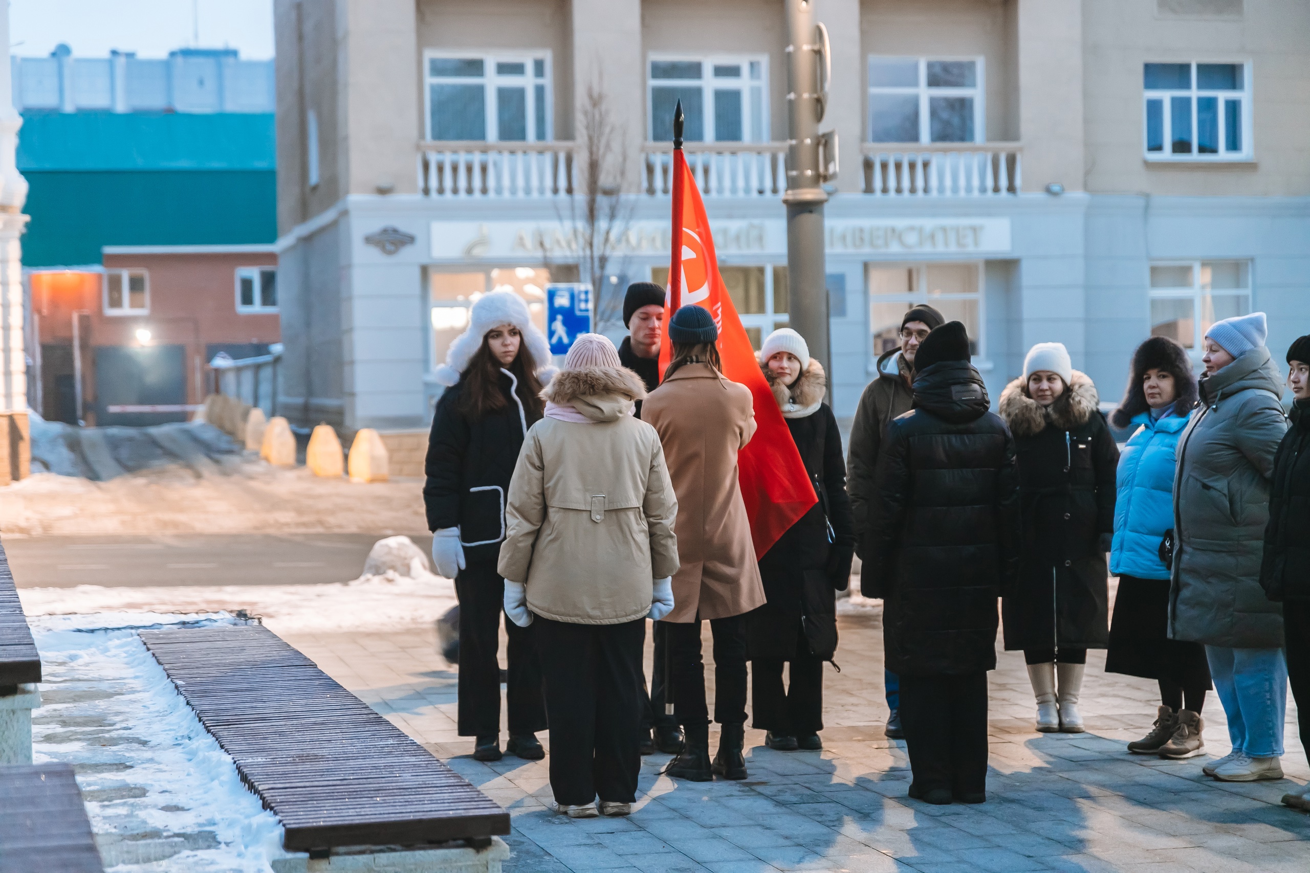 Далее в торжественной обстановке состоялась передача копии Знамени Победы – символа мужества и стойкости. «Эстафета Знамени Победы» перешла к Институту физики, математики, цифровых и нанотехнологий.