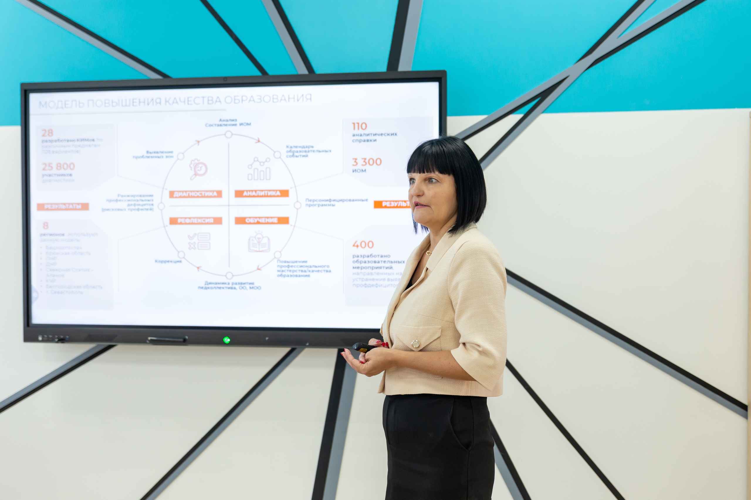 Руководитель Научно-методического центра сопровождения педагогических работников Оксана Гумерова рассказала об уникальной информационно-аналитической платформе развития кадрового потенциала региональной системы образования, диагностику на которой уже прошли более 25 тысяч учителей из разных субъектов России. Лучшие педагогические практики специалисты ИНПО «Вектор развития» тиражируют на возвращенных российских территориях и в рамках учебно-педагогического округа.