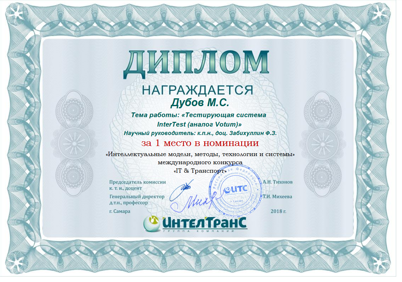 Сейчас Михаил дорабатывает систему интерактивного тестирова­ния (СИТ), идею создания которой подкинул его руководитель. В результате его «продукт» позволяет с помощью приложения, установленно­го на смартфон, проверять знания по любому предмету. Основная же про­грамма устанавливается на компью­тер. Аналог (Votum) уже разработан российской компанией и стоит поряд­ка 60 тысяч рублей в расчёте на 25 пользователей. Не каждой школе по карману Votum. Высокая цена объясняется дополнительным оборудованием: реси­вером и дорогостоящими пультами. Миша предлагает вместо пультов ис­пользовать смартфон, а вместо реси­вера - Wi-Fi, что должно удешевить си­стему тестирования. Проект практиче­ски завершён: осталось разработать защиту от взлома и запатентовать.