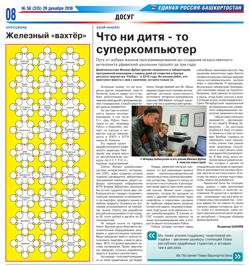 20 декабря в газете "Единая Россия - Башкортостан" вышла интересная статья о Михаиле Дубове, воспитаннике  доцента кафедры прикладной информатики Забихуллина Фларида Загидулловича. Занятия проходят в Центре детского творчества «Глобус» (лаборатория программной инженерии). Его работы неоднократно были высоко оценены профессионалами на различных IT-конкурсах, выставках. Одним из последних стал первое место на международном конкурсе "IT & Транспорт", г. Самара.