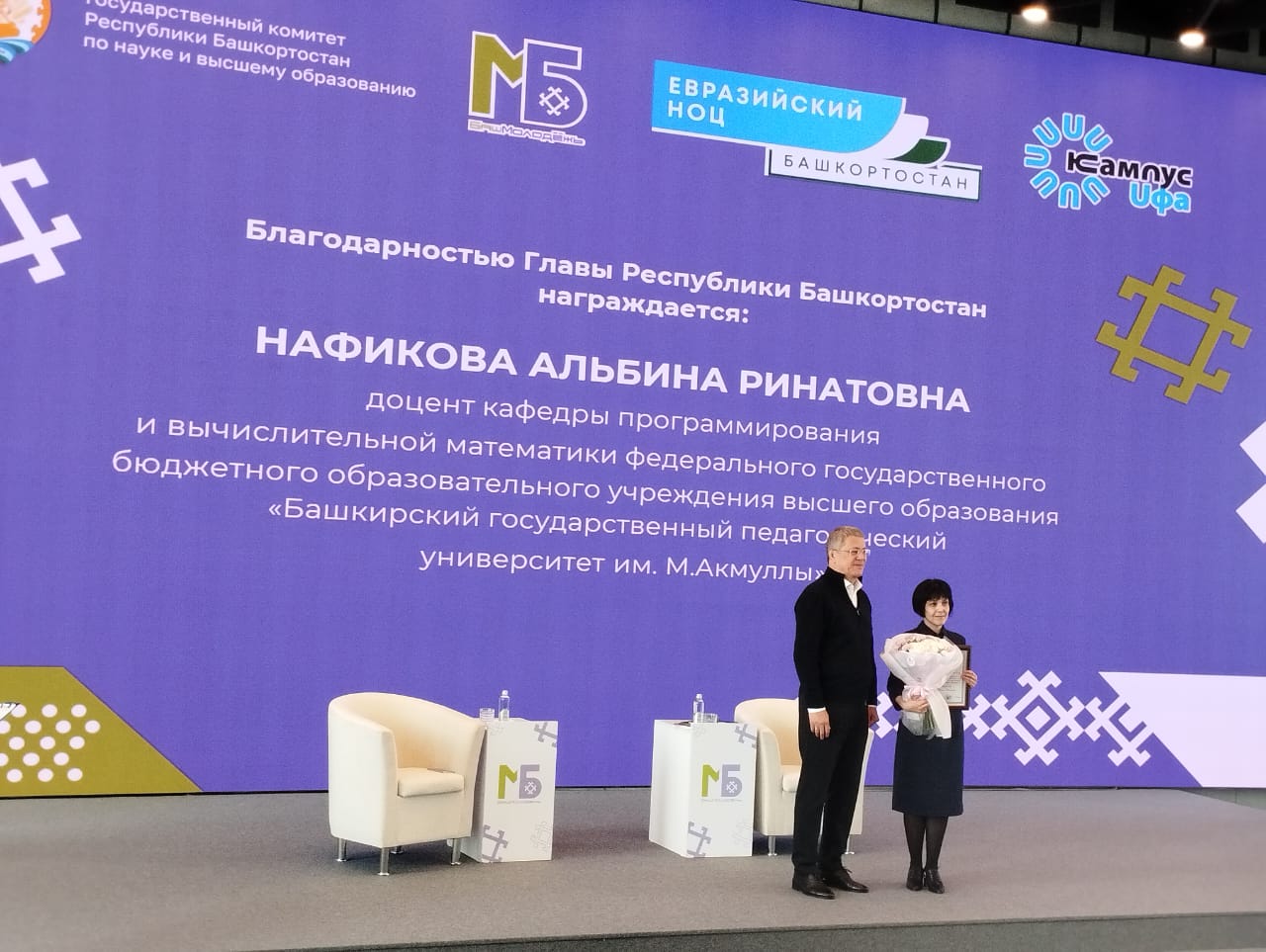 Торжественное награждение состоялось в рамках Форума молодых учёных Республики Башкортостан, организованного Государственным комитетом Республики Башкортостан по науке и высшему образованию совместно с Евразийским научно-образовательным центром мирового уровня «Евразийский НОЦ».