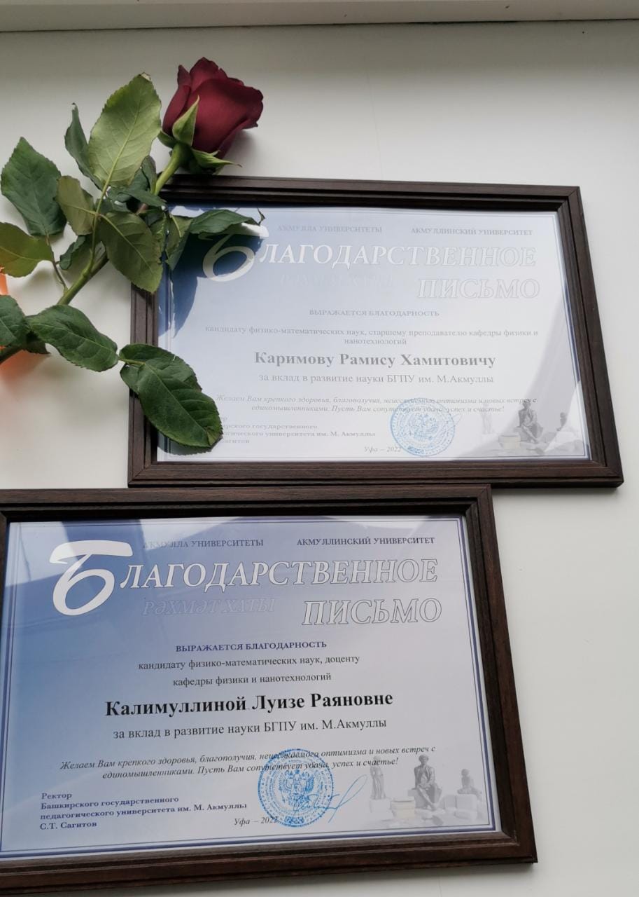 Студентка 3 курса направления Прикладная информатика Курбангалеева Карина Расимовна, студенты 3 курса направления Электроника и наноэлектроника Давлятгареев Халил Ильясович, Яркиев Олег Эдуардович, Яхин Артур Римович, преподаватели кафедры физики и нанотехнологий Калимуллина Луиза Раяновна, Каримов Рамис Хамитович, аспиранты  Института Киан Мохаммадамин и Байрамдурдыев Давут  получили награды за вклад в развитие науки БГПУ им. М. Акмуллы.