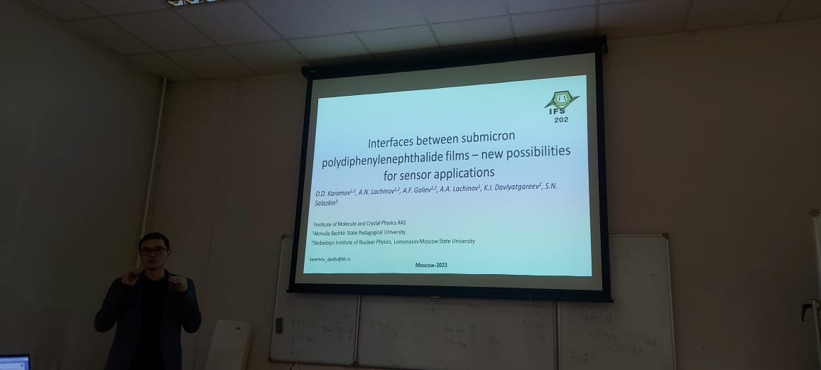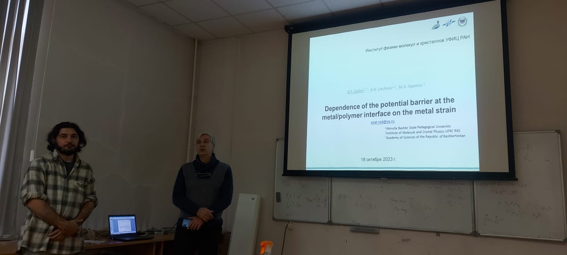 С  докладами выступили Галиев Азат Фаатович "Зависимость потенциального барьера на границе раздела металл/полимер от напряжений в металле" и  Карамов Данфис Данисович "Граница раздела между субмикронными пленками полидифениленфталида – новые возможности для сенсорных применений".