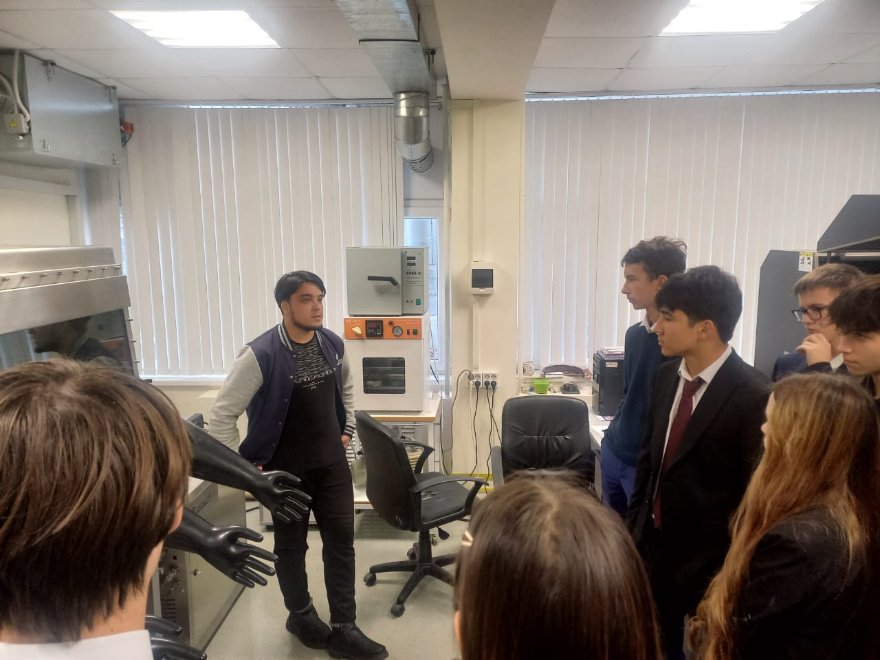 Гости ознакомились с оснащением лаборатории дополненной реальности, научно-исследовательским и технологическим оборудованием для изучения органических полупроводниковых материалов в широком диапазоне температур 6К-300К.