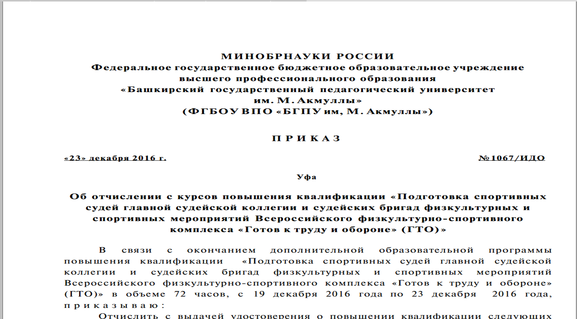 На базе факультета физической культуры завершились курсы повышения квалификации «Подготовка спортивных судей главной судейской коллегии и судейских бригад физкультурных и спортивных мероприятий Всероссийского физкультурно-спортивного комплекса «Готов к труду и обороне». Приказ об отчислении с выдачей удостоверения о повышении квалификации слушателей доступен для скачивания ниже.  _________________________