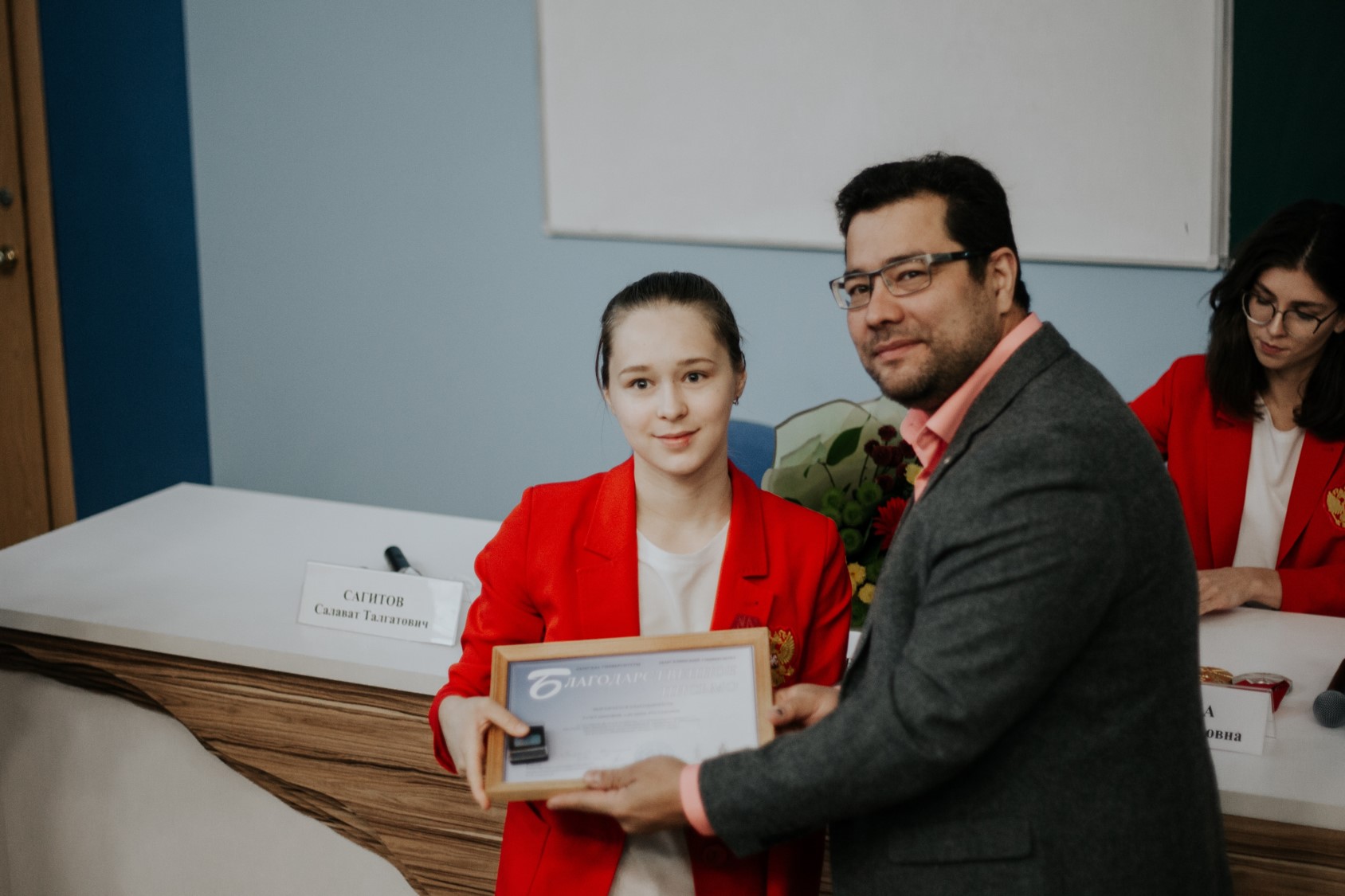 Он наградил Аделину Разетдинову, Анну Крившину и Сергея Трухачева благодарственными письмами университета.