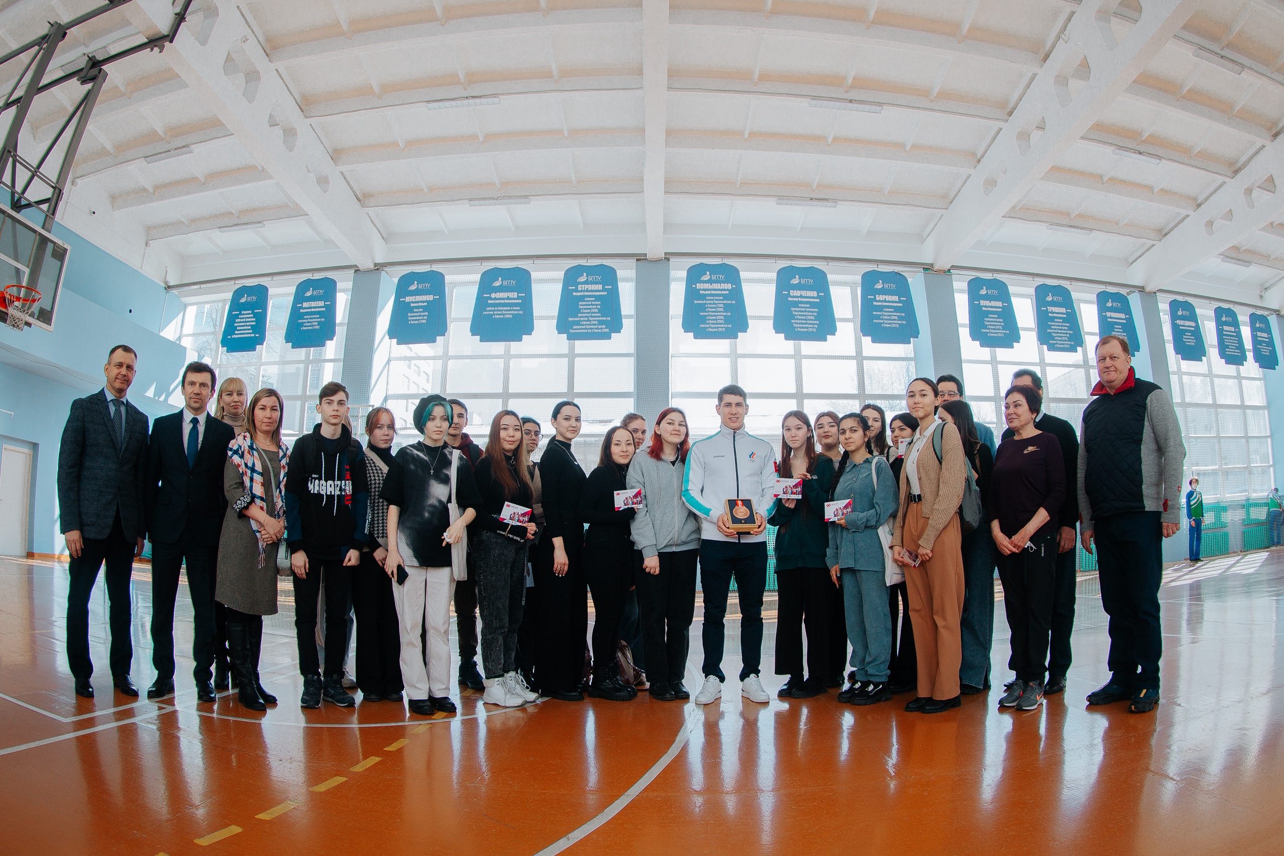 Далее в торжественной обстановке состоялось поднятие под своды спортивного зала БГПУ им. М. Акмуллы именного свитера российского биатлониста Эдуарда Латыпова.