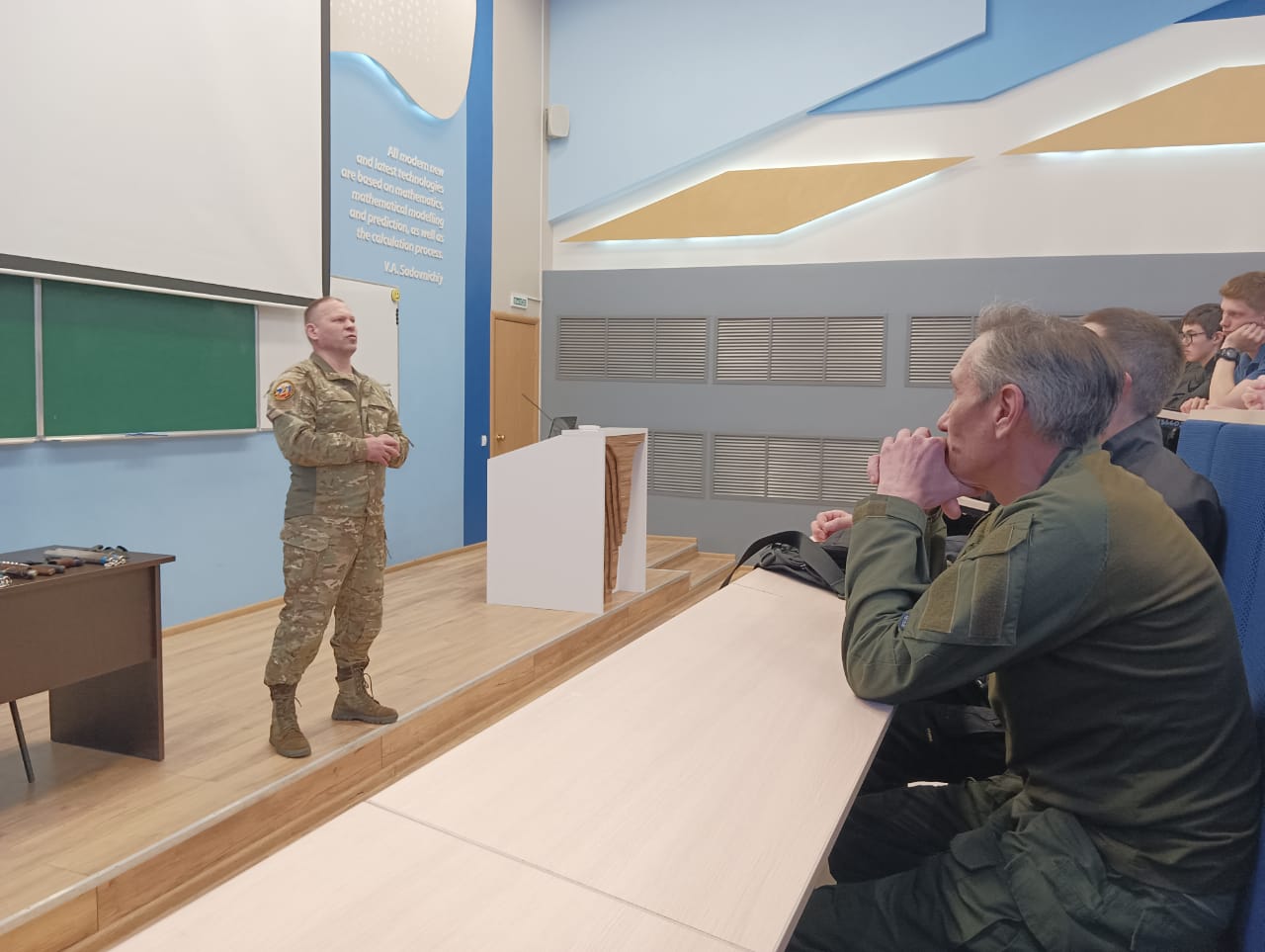 Инструктор по боевой и физической подготовке, ветеран СВО, командир разведроты и кавалер Ордена Мужества Артур Якупов поделился с участниками своими воспоминаниями о буднях защитников Отечества. Его рассказ о реальных боевых действиях и опыте службы стал важной частью мастер-класса, помогая студентам лучше понять психологию и физические аспекты защиты.