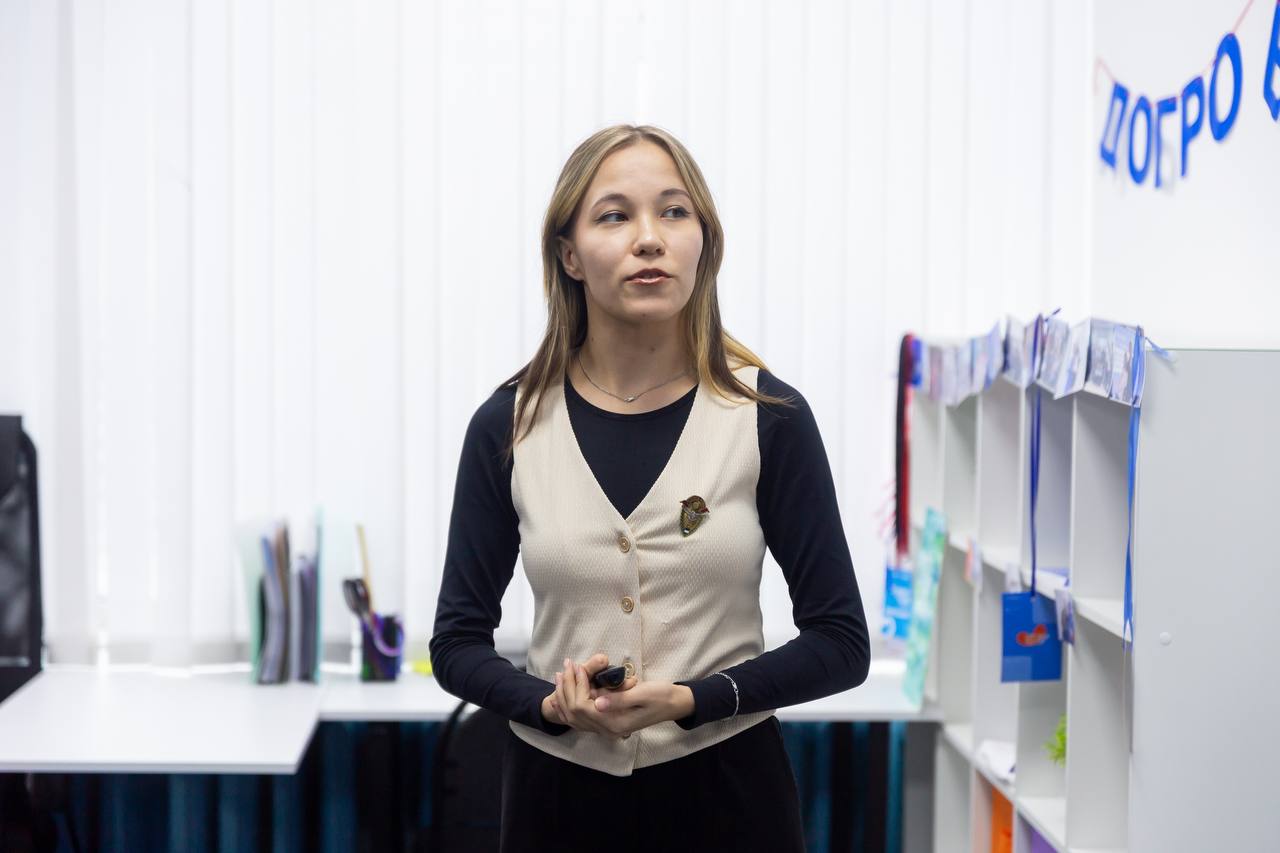 Визит представителя федерального Минпросвещения начался с фотовыставки «Как молоды мы были...», посвященной стройотрядовскому движению Республики Башкортостан. В кабинете студенческого самоуправления Александру Бугаеву руководитель волонтерского Добро.Центра Зарина Мирабдуллаева рассказала о добровольческой деятельности вуза: